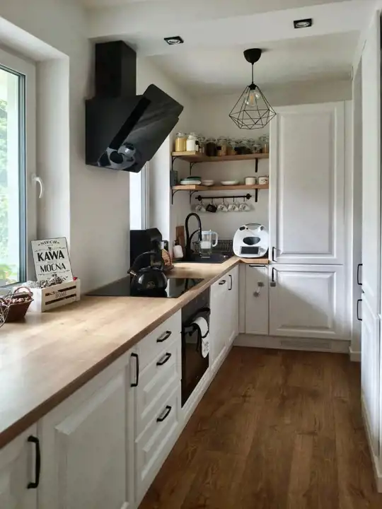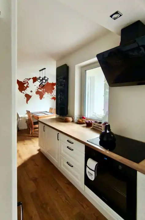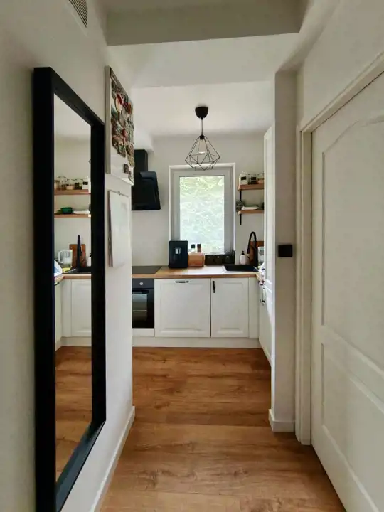 Kuchnia - otwarta na salon, wyposażona w sprzęt AGD, bardzo słoneczna.