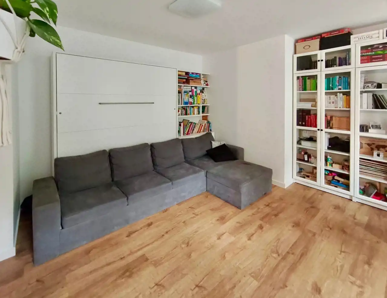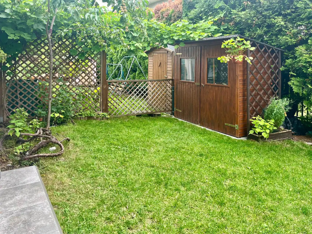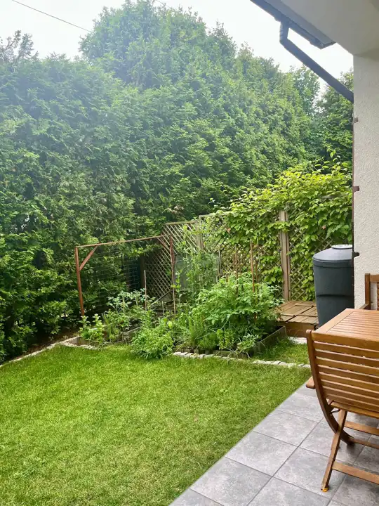 Salon - jasny, ustawny, z bezpośrednim dostępem do słonecznego ogródka (60 m²) otoczonego zielenią, gwarantującego prywatność. Słoneczny taras jest idealnym miejscem do odpoczynku i spotkań z bliskimi.
