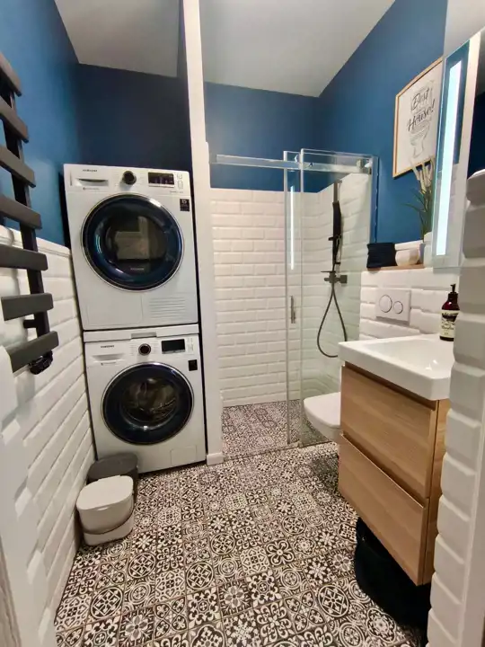 Łazienka - wykończona starannie płytkami we włoskim klimacie, prysznic z odpływem liniowym, miejsce na pralkę i suszarkę, podświetlane lustro. Łazienka jest połączona z WC.