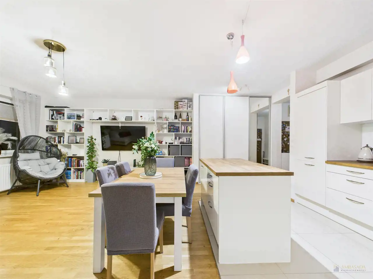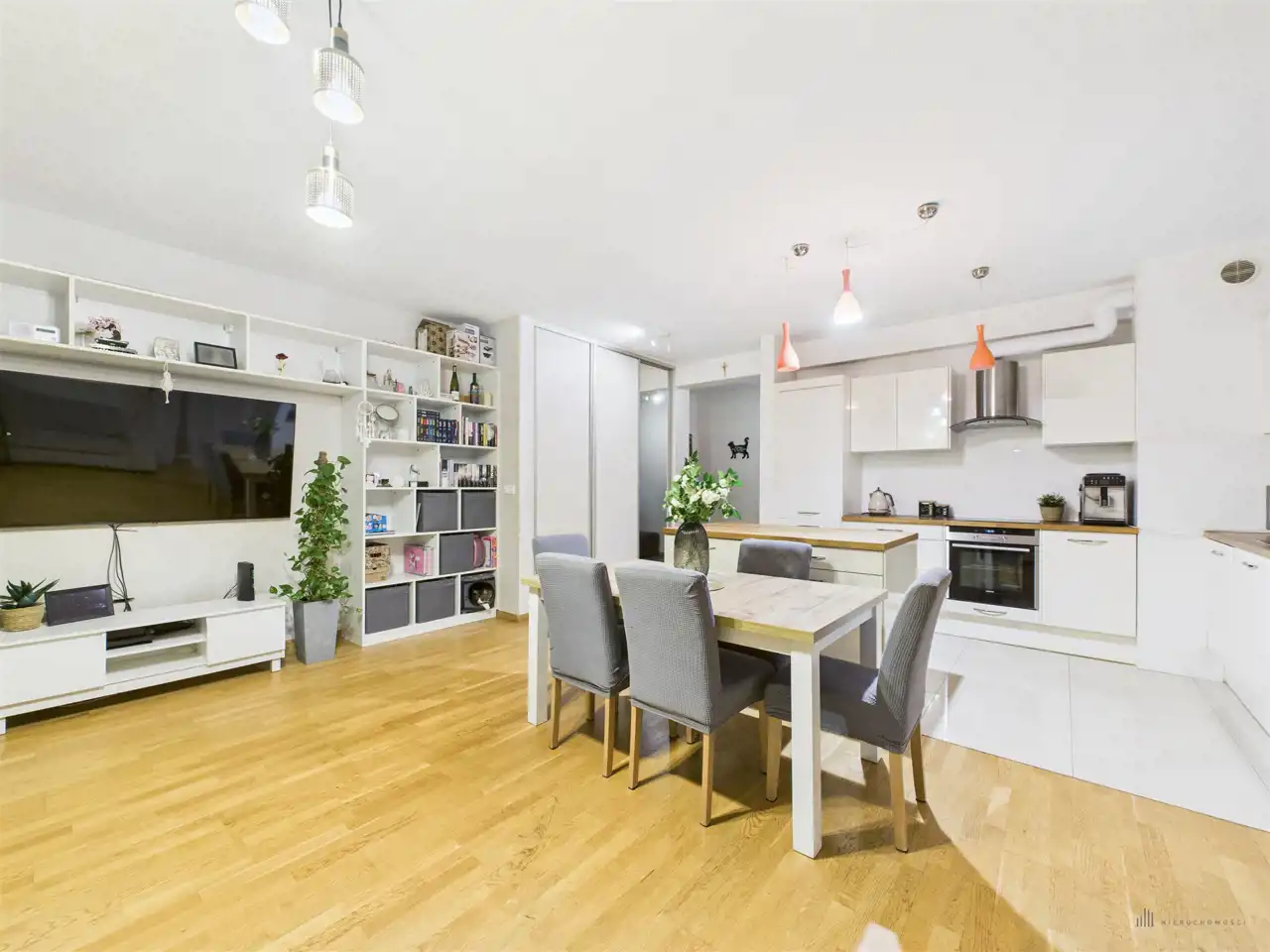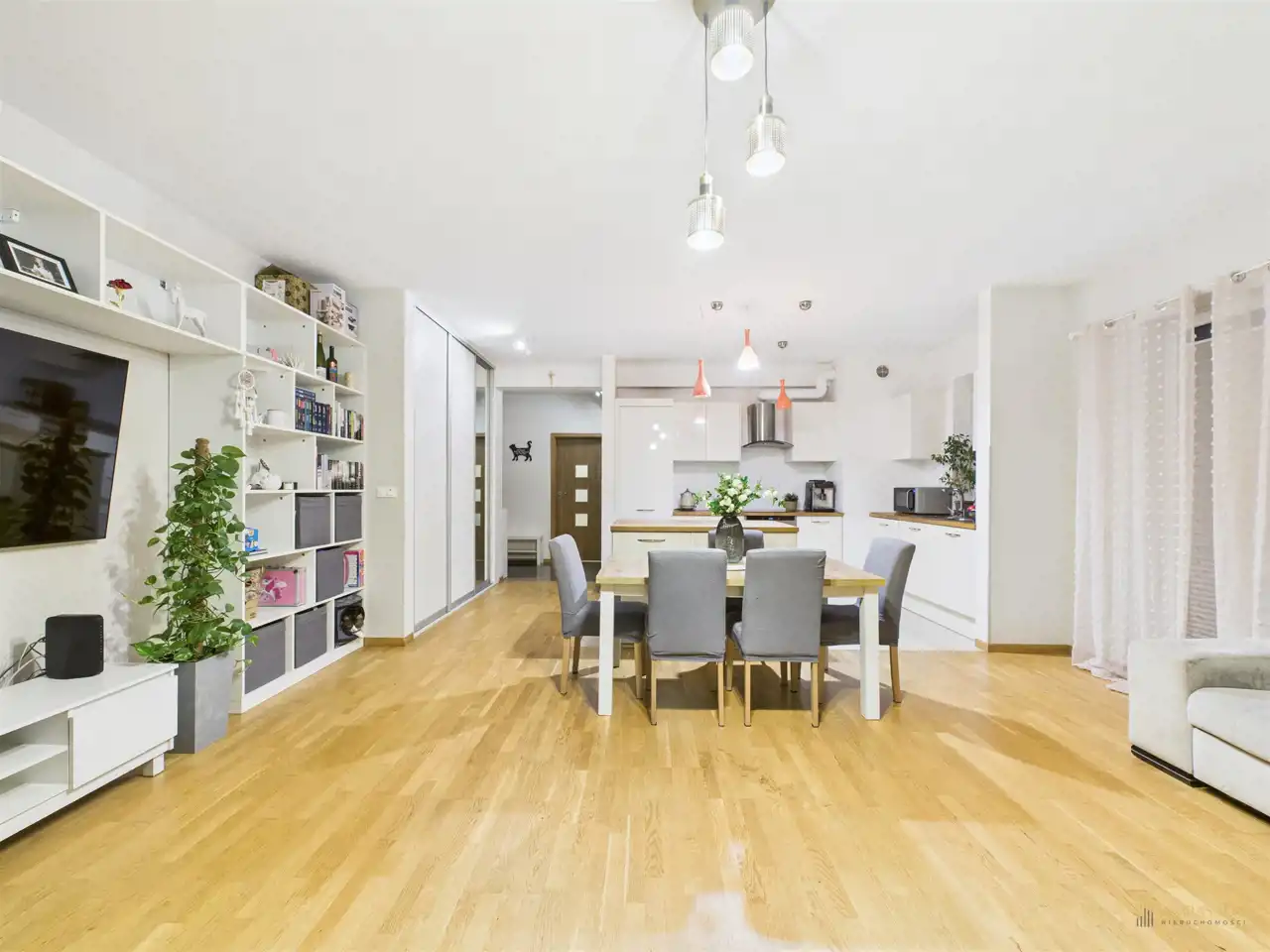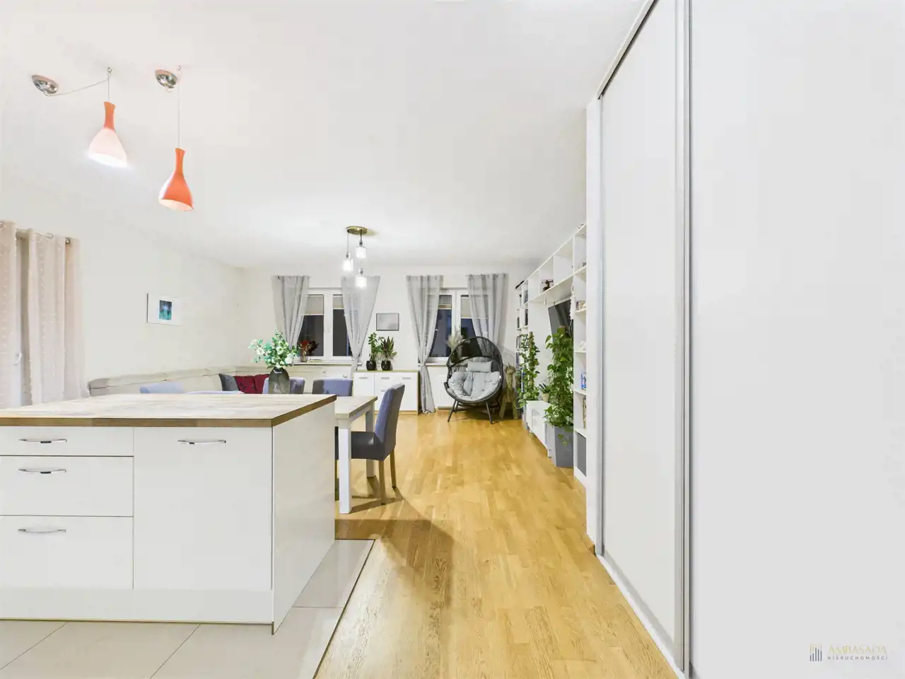 Wnętrza wykończone w spójnej i stonowanej kolorystyce. Kuchnia wyposażona w niezbędne sprzęty AGD tj. lodówka z zamrażarką, płyta indukcyjna, piekarnik oraz zmywarka. Na podłogach drewniana deska.