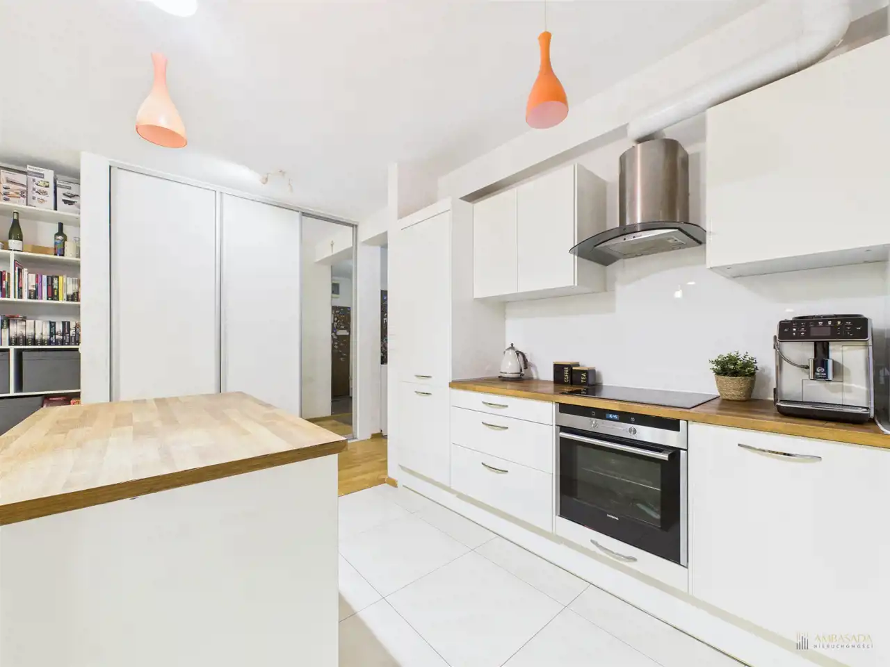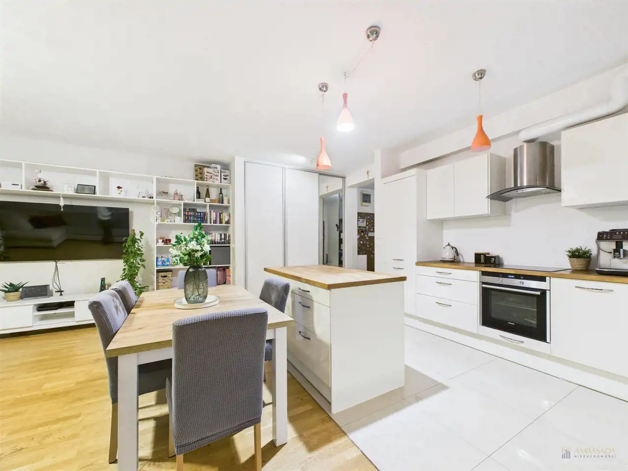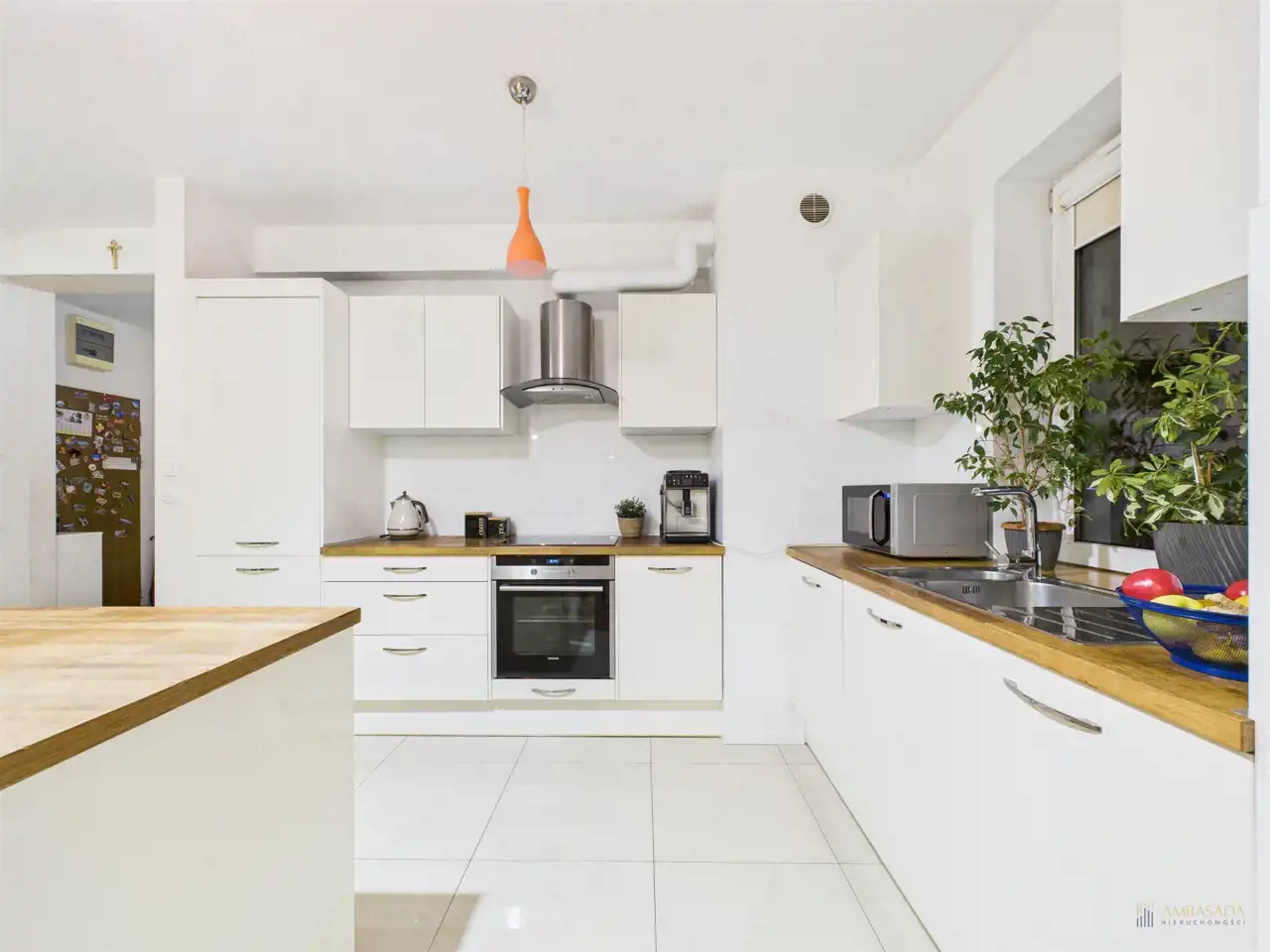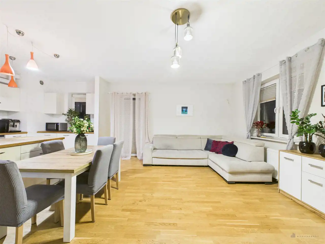 Wnętrza wykończone w spójnej i stonowanej kolorystyce. Kuchnia wyposażona w niezbędne sprzęty AGD tj. lodówka z zamrażarką, płyta indukcyjna, piekarnik oraz zmywarka. Na podłogach drewniana deska.