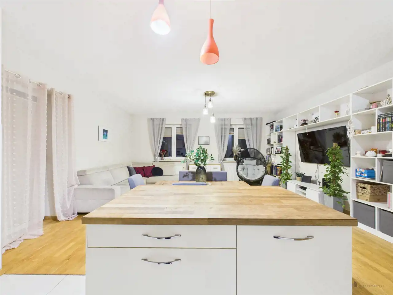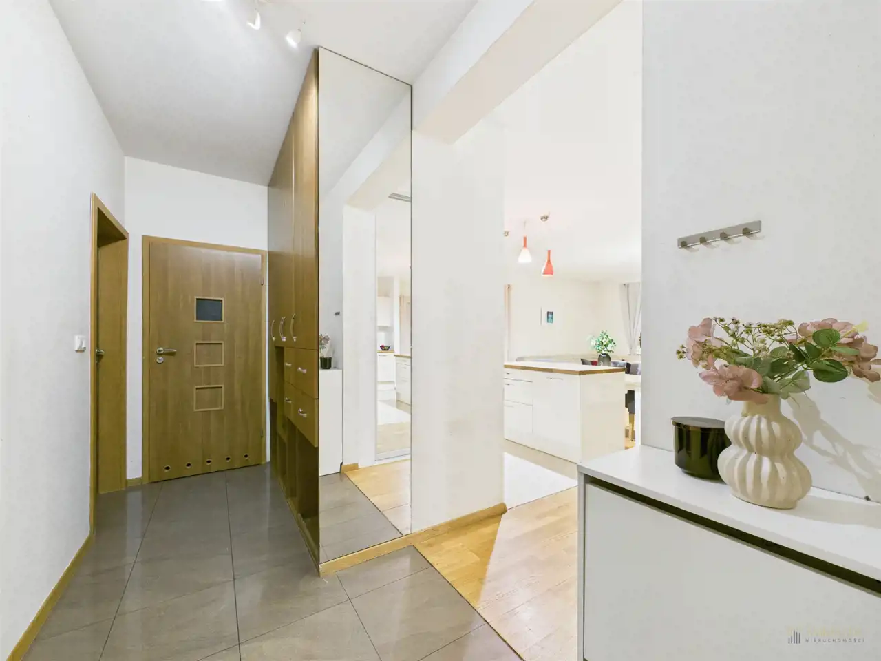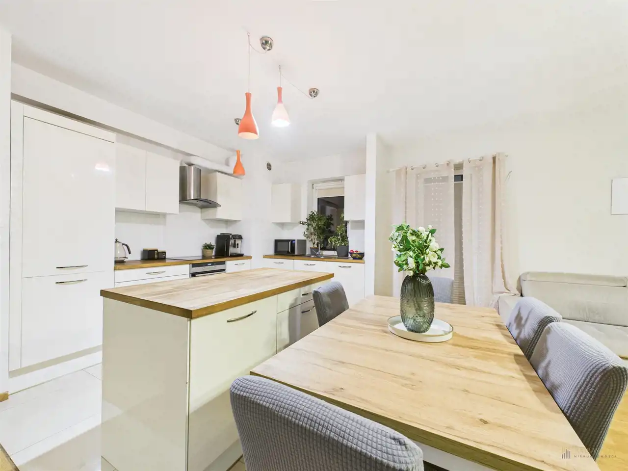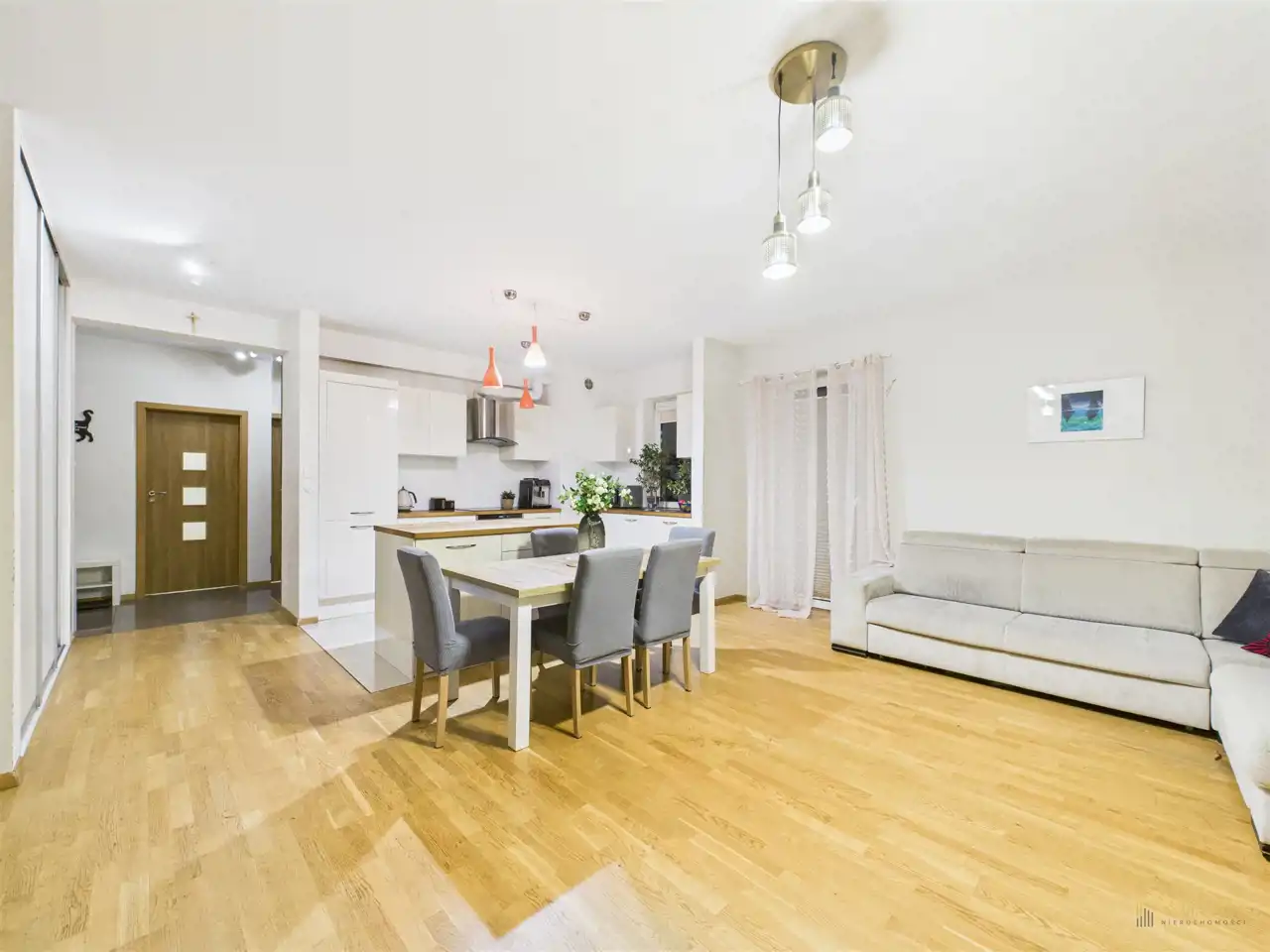 Wnętrza wykończone w spójnej i stonowanej kolorystyce. Kuchnia wyposażona w niezbędne sprzęty AGD tj. lodówka z zamrażarką, płyta indukcyjna, piekarnik oraz zmywarka. Na podłogach drewniana deska.