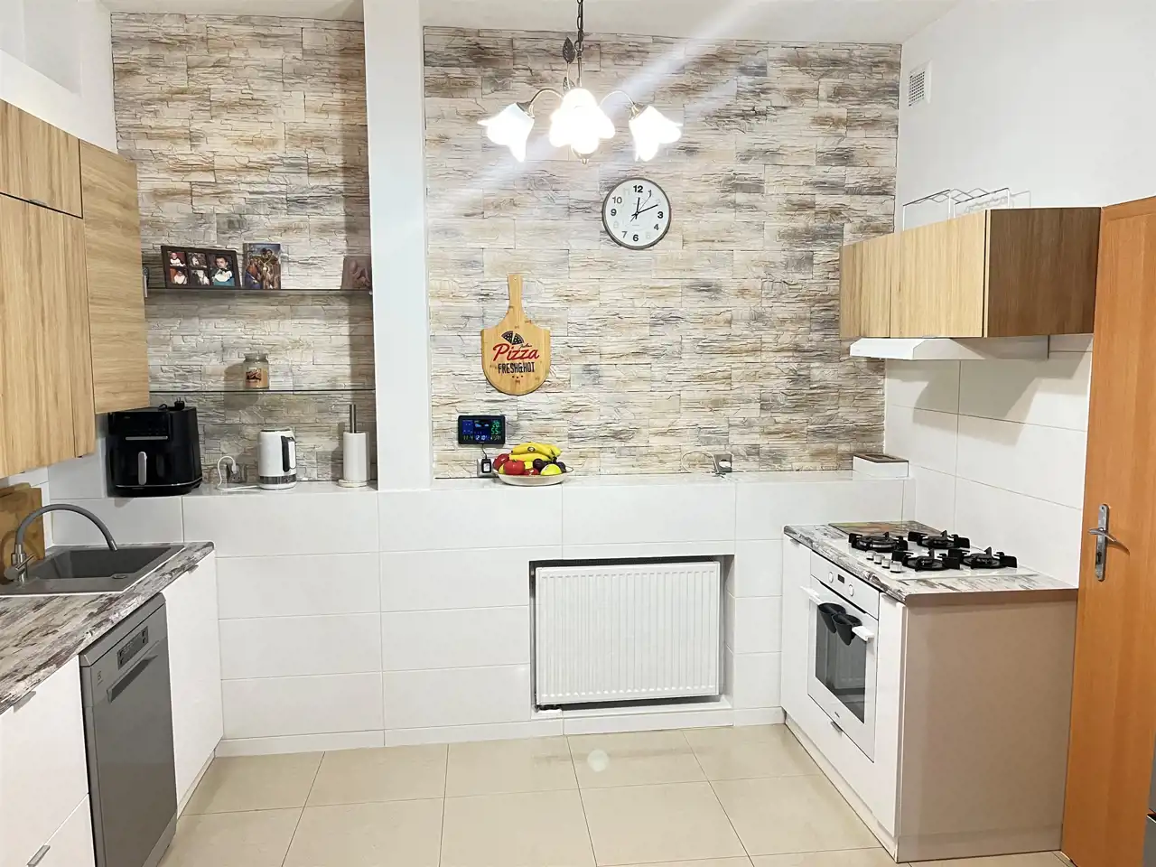 Kuchnia jest zabudowana ii wyposażona w sprzęt AGD znanych marek.