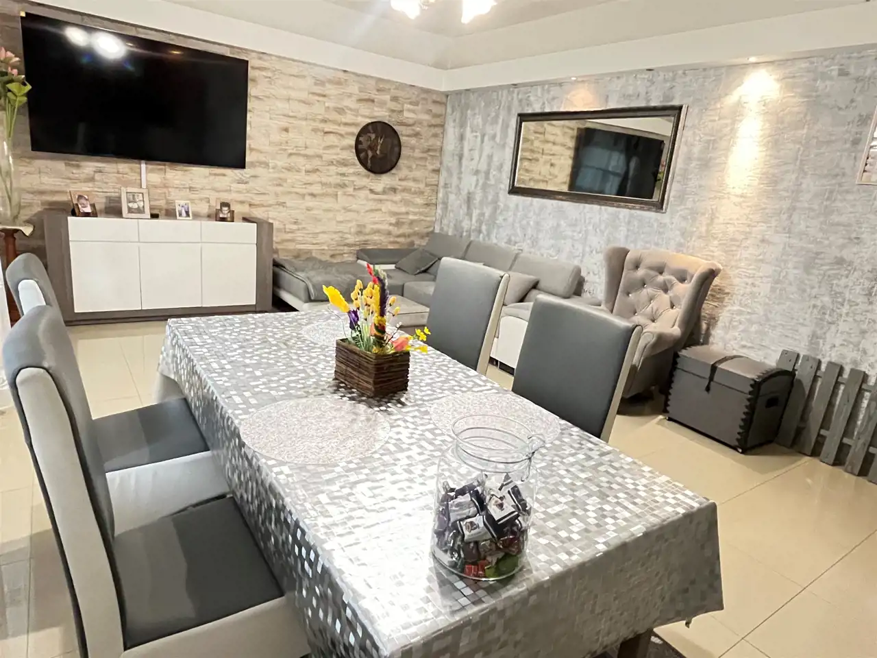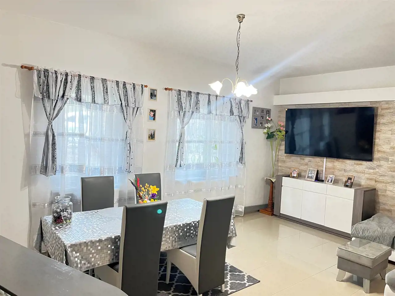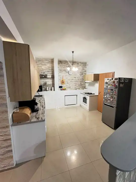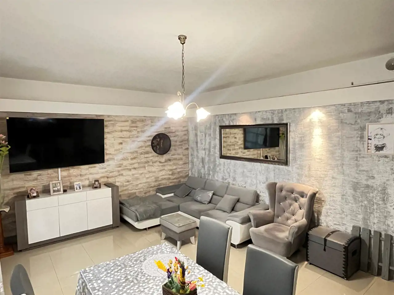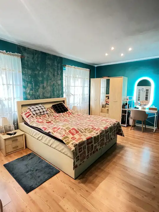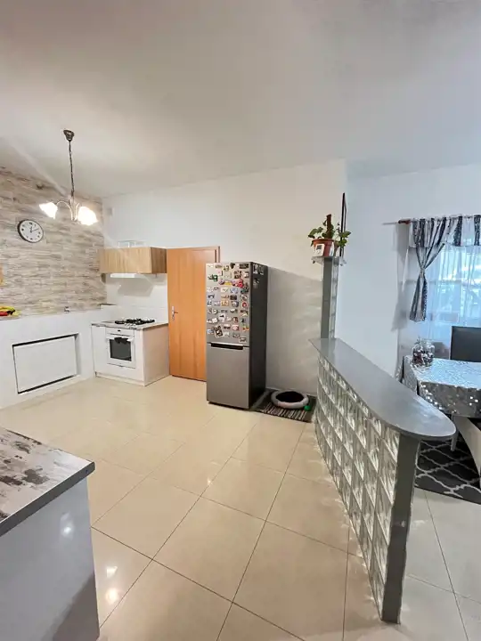 Stworzono przestronną strefę dzienną: salon z miejscem na duży stół, ogromny narożnik i aneks kuchenny z całym wyposażeniem oraz prywatną strefą: 2 sypialni, łazienka i pralnia.