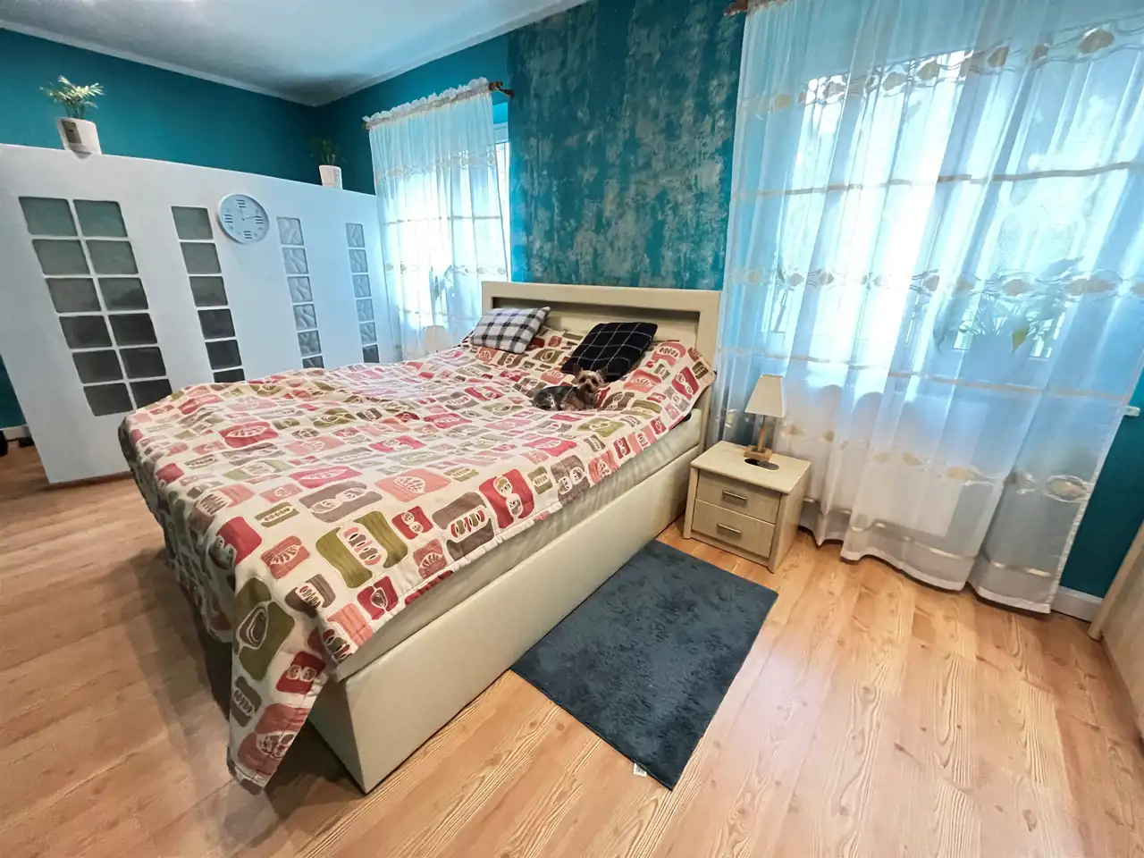 Całe mieszkanie jest w bardzo dobrym stanie, jest zadbane i urządzone w jasnych, ciekawych barwach.