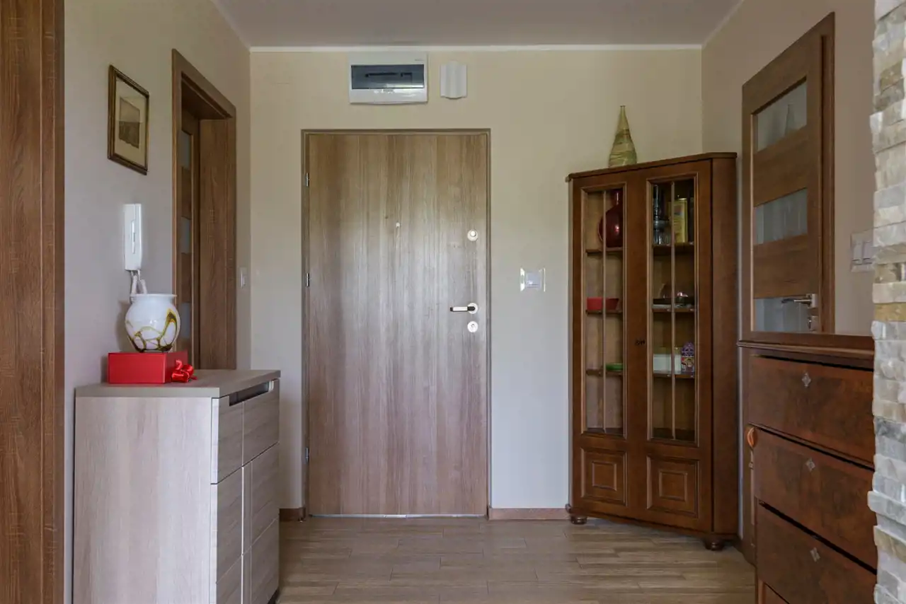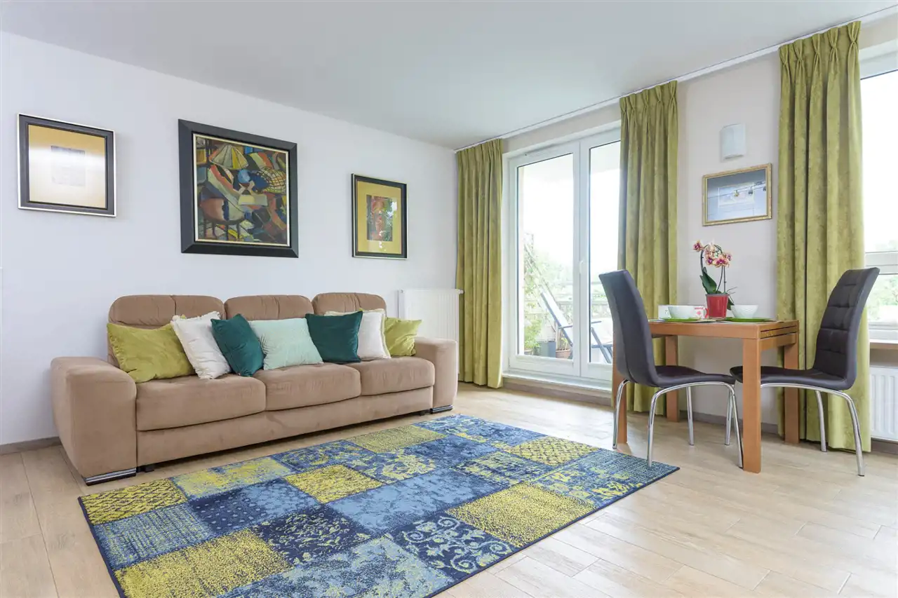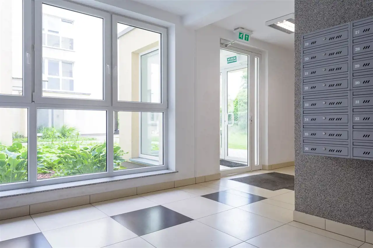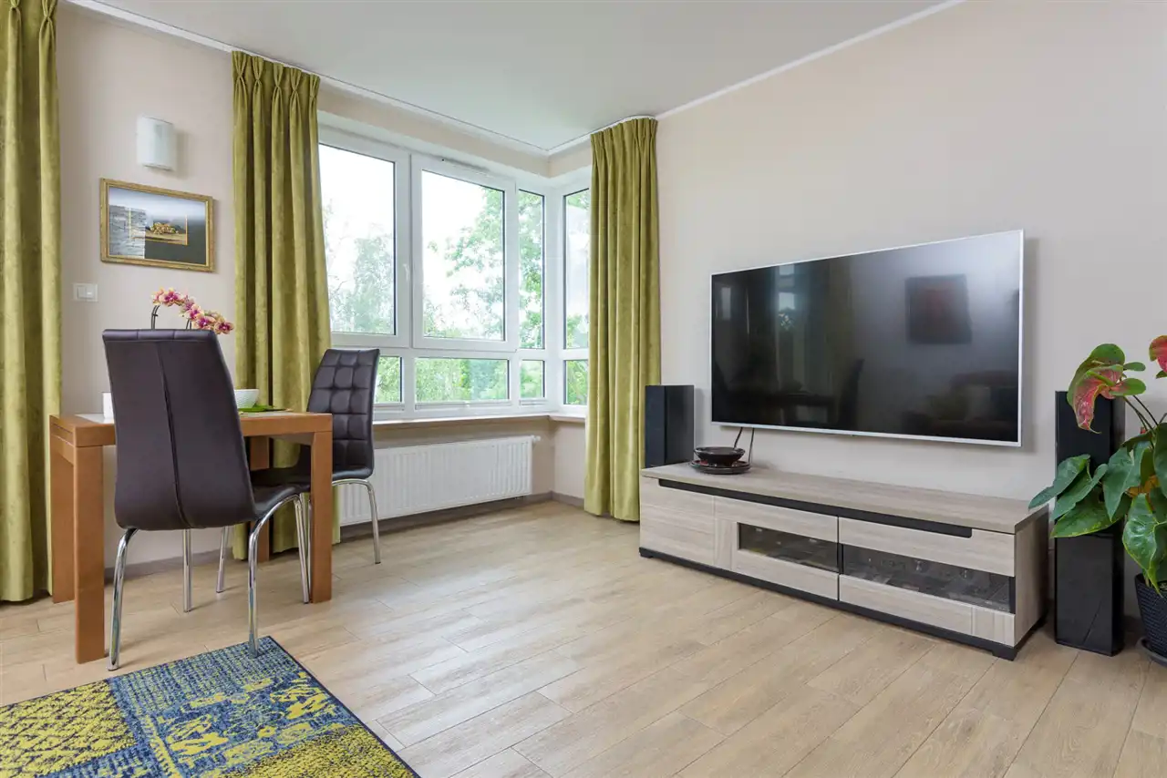Mieszkanie 2 pokojowe o powierzchni ponad 61 metrów kwadratowych mieści wszystkie potrzebne wygody. Mamy tu bardzo dużą sypialnie - prawie 15 metrów kwadratowych, w której oprócz dużego łóżka zmieścisz biurko. Dużym atutem jest wielki salon z aneksem kuchennym z wyjściem na balkon, który łączy się z korytarzem dając poczucie przestrzeni i komfortu. Dodatkowo jest tutaj garderoba - jakże często pomijane przez deweloperów pomieszczenie, które bardzo poprawia komfort życia. Nie wspominając już o bardzo dużej łazience prawie 6,5 metra kwadratowego. Każde z mieszkań w budynku ma indywidualne ustawienie ogrzewania - nawet w lato można je włączyć. Gdyby trzeba było jednym słowem określić te mieszkanie - jest to przestrzeń. Także za oknem. Widok na domki jednorodzinne i drzewa uspakaja i relaksuje.