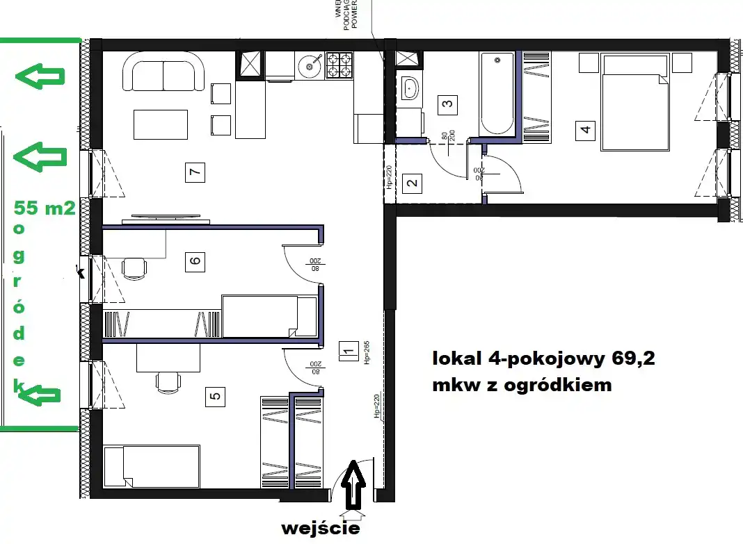 Przedmiotem oferty jest 4-pokojowe mieszkanie z miejscem parkingowym i ogródkiem 55m2. Garaż dodatkowo płatny 40000 zł.