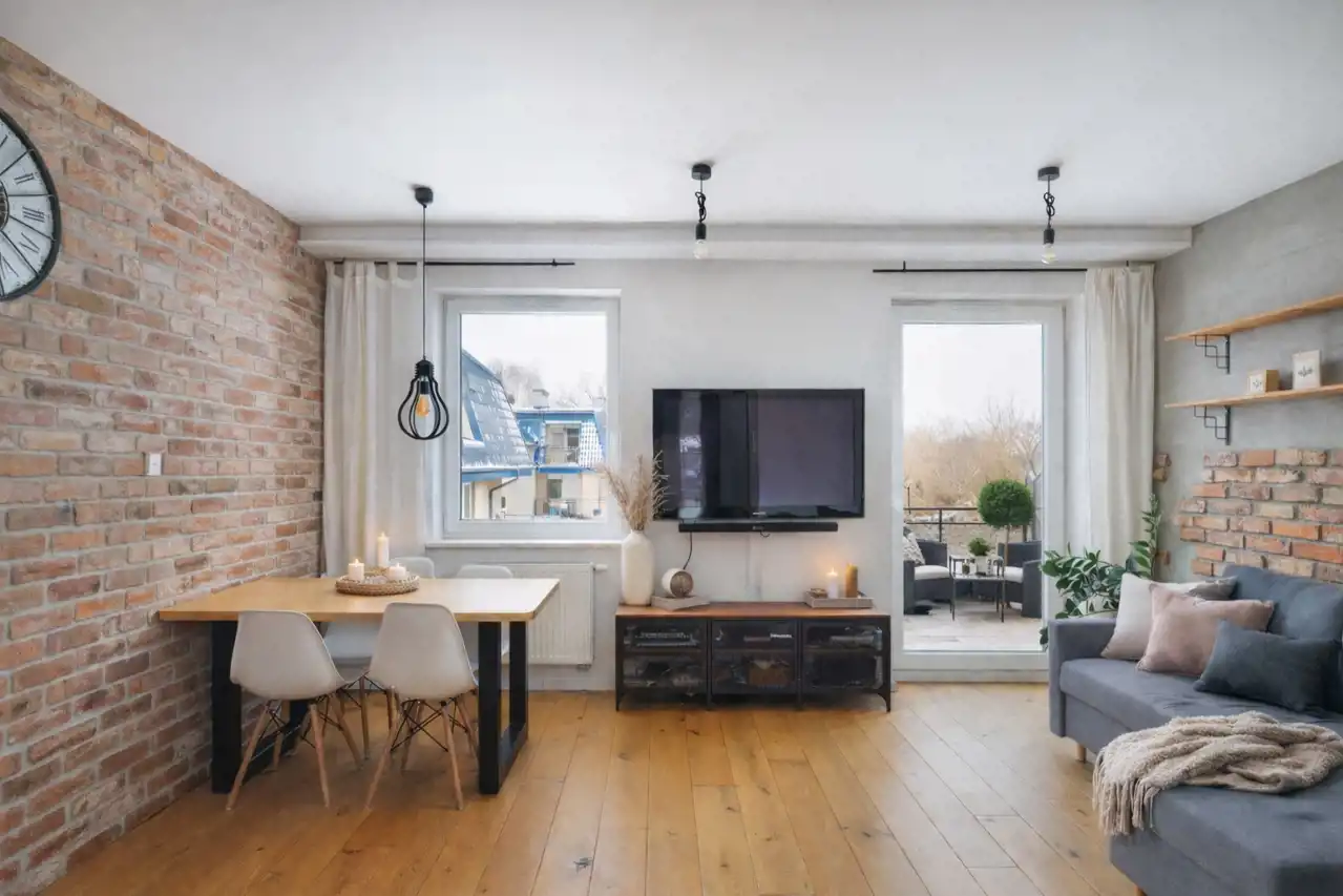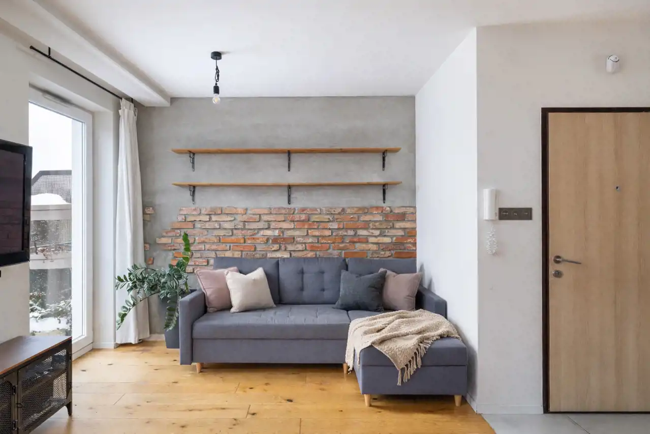 • Ściana z oryginalnej, 100-letniej cegły rozbiórkowej w salonie