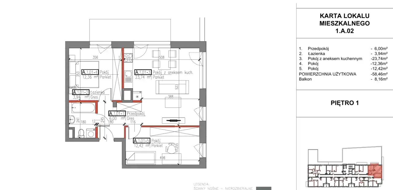 - Charakterystyka mieszkania 58.46 m2, 3 pokoje