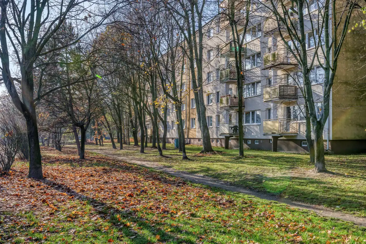 Budynek, w którym znajduje się mieszkanie, to trzypiętrowy blok z 1979 roku, wykonany w technologii wielkiej płyty. Lokal usytuowany jest na trzecim, ostatnim piętrze, co gwarantuje większe poczucie prywatności oraz brak hałasów z góry. W 2000 roku wymieniono w nim okna, co wpłynęło na poprawę izolacji termicznej i akustycznej.