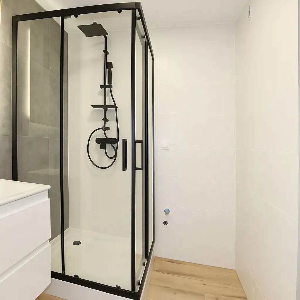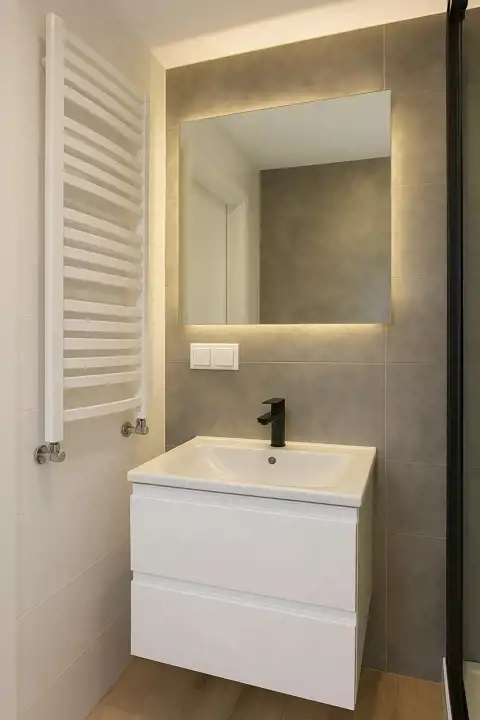 - łazienka została w całości wykafelkowana i wyposażona w nową kabinę prysznicową, podwieszaną toaletę (stelaż), umywalkę z szafką, lustro z podświetleniem LED oraz przygotowane miejsce na pralkę.