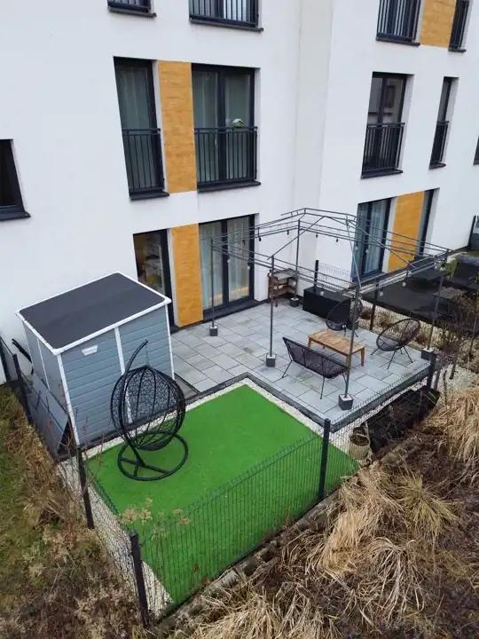To wyjątkowe mieszkanie na parterze daje poczucie domu – z prywatnością, komfortem i dwoma ogrodami, które stają się naturalnym przedłużeniem salonu oraz dwóch pokoi.
