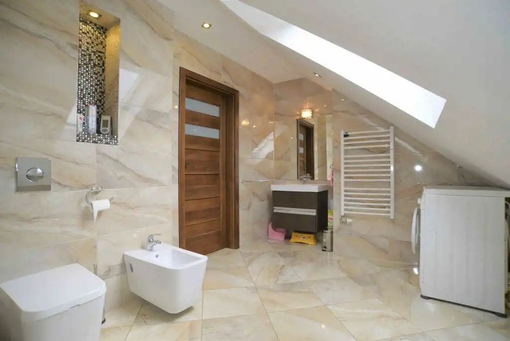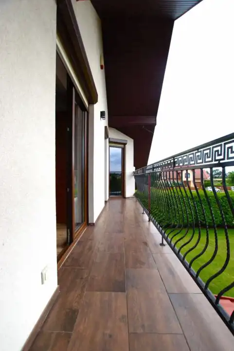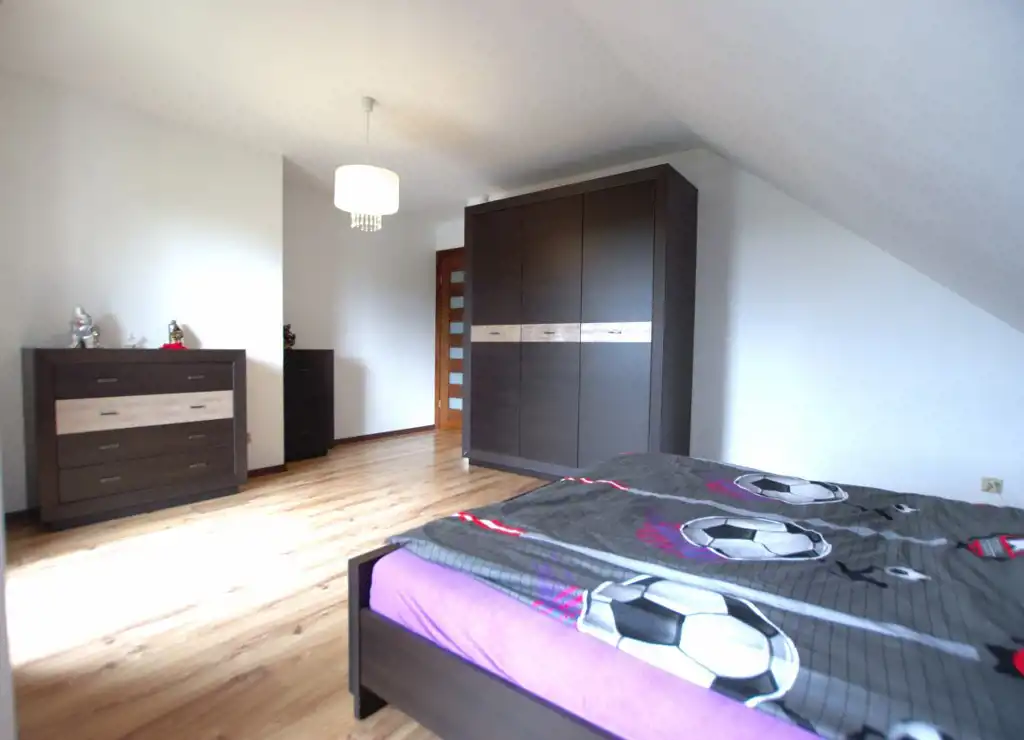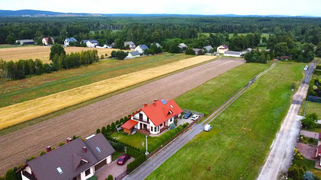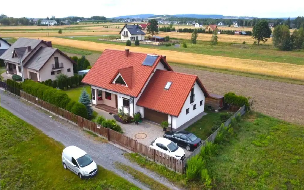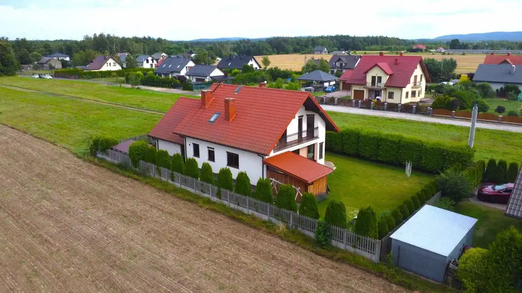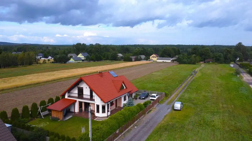 Brama wjazdowa na posesję oraz do garażu otwierane na pilota. Dom posiada podgrzewanie podłogowe na parterze oraz łazience na piętrze. Dom ocieplony styropianem, pokryty blachodachówką. W domu zainstalowane są rolety antywłamaniowe, alarm oraz wideodomofon.