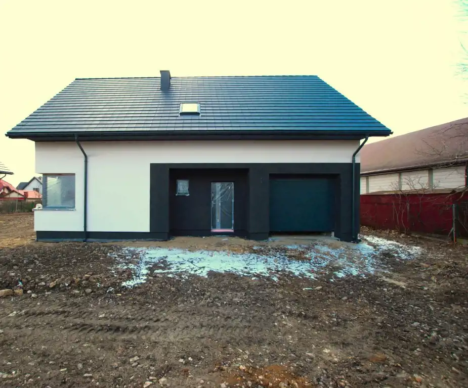 Ogrzewanie domu możliwe za pomocą pompy ciepła lub z pieca na pellet/ekogroszek. Dom wybudowany z bloczków H+H. Dach pokryty dachówką betonową. Okna trzyszybowe, plastikowe. Garaż zamykany bramą na pilota. Prąd oraz woda doprowadzone do budynku. Na terenie działki znajduje się szambo.