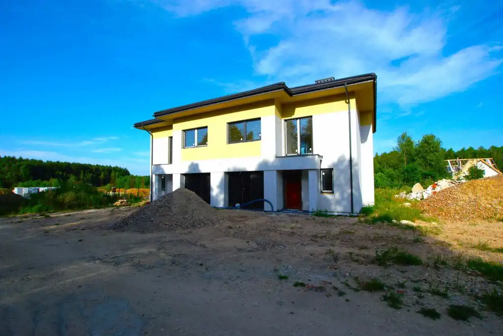 Budynki wybudowane z betonu komórkowego, pokrycie dachu dachówką płaską. Ocieplenie styropian 18 cm. Okna 3 szybowe firmy Apolloplast. Ogrzewanie pompą ciepła.. Istnieje możliwość zamontowania kominka. Ogrzewanie podłogowe na parterze oraz piętrze.