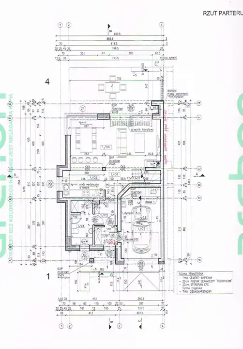 *parteru: przedpokój, salon z aneksem kuchennym z wyjściem na taras z kostki brukowej, łazienka, kotłownia, garaż (18,2 m2);