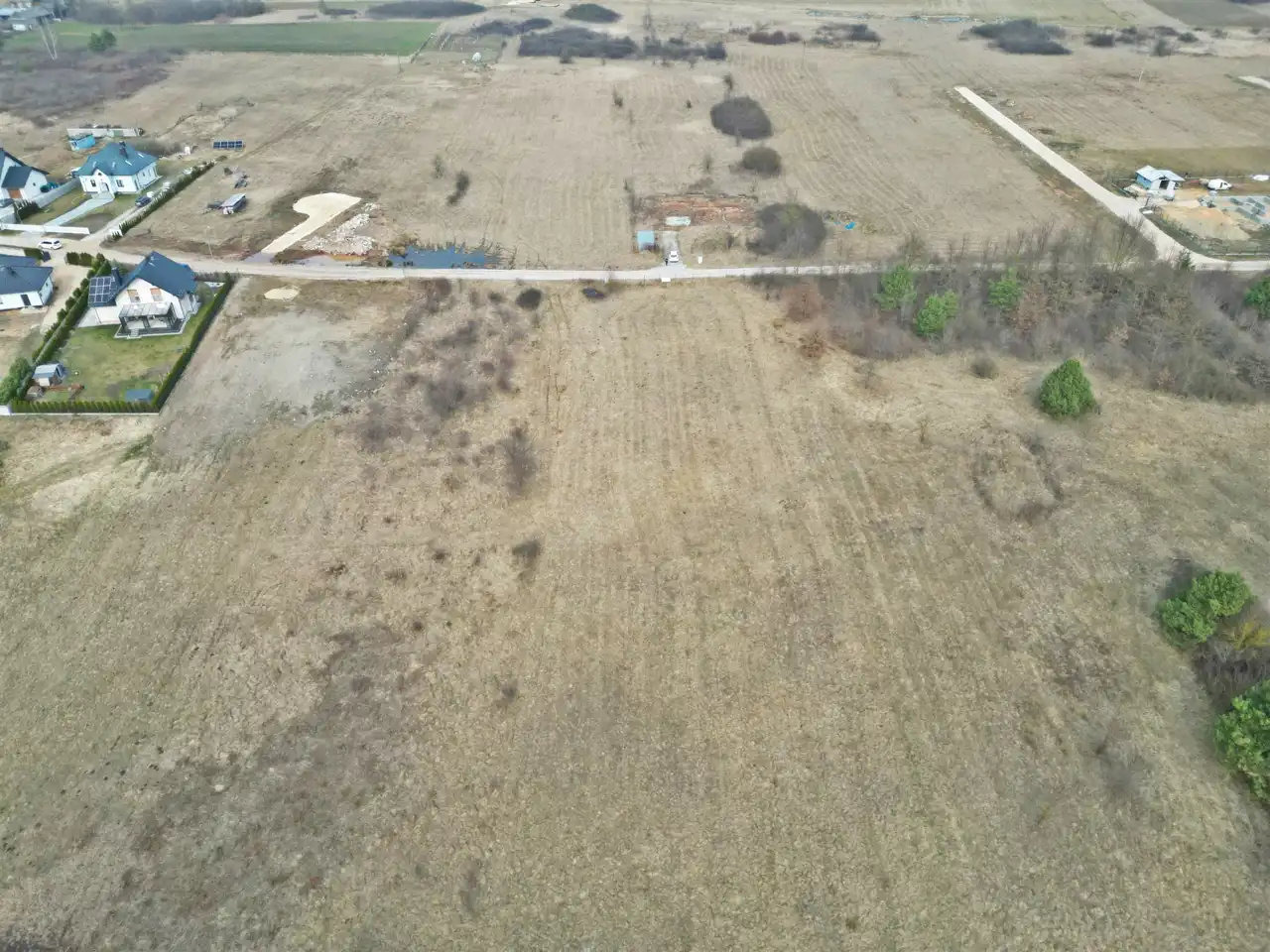 Działka położona w drugiej linii od strony drogi, dojazd własną drogą wewnętrzną o szerokości ok. 6m.