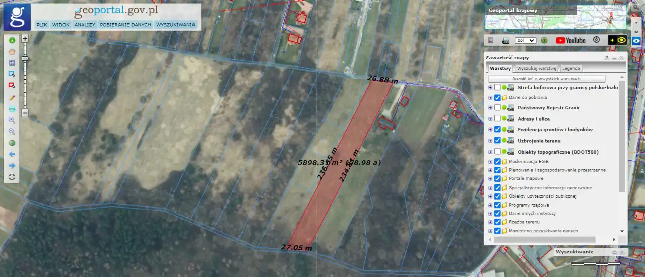 A land property with an area of 5800 m² located in Jaworznia, Piekoszów municipality. The plot is accessible via a municipal dirt road (road width approximately 3-4 meters). The land is flat and trapezoidal in shape (close to rectangular).