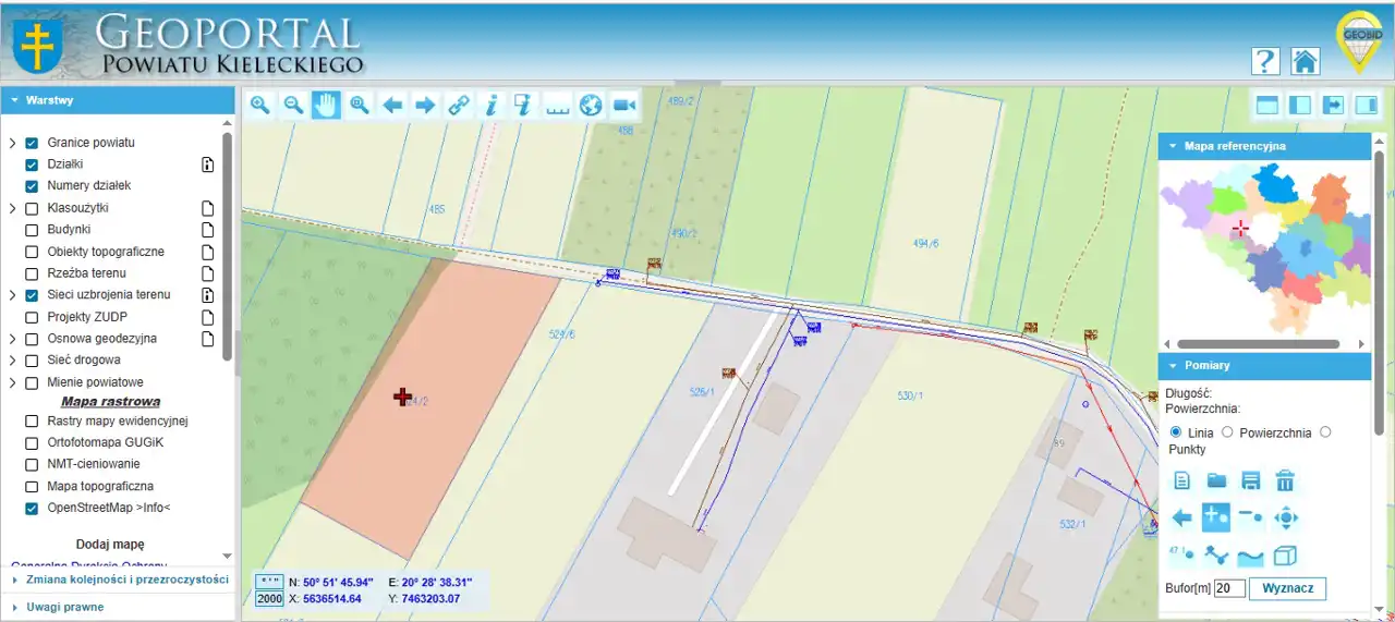 Very good location: in the immediate vicinity a primary school (approx. 400 m from the plot), a bus stop; nearby shops, supermarkets, green and recreational areas (Moczydło Nature Reserve, Chelosiowa Jama). Approx. 13 km to the centre of Kielce (about 20 minutes by car).