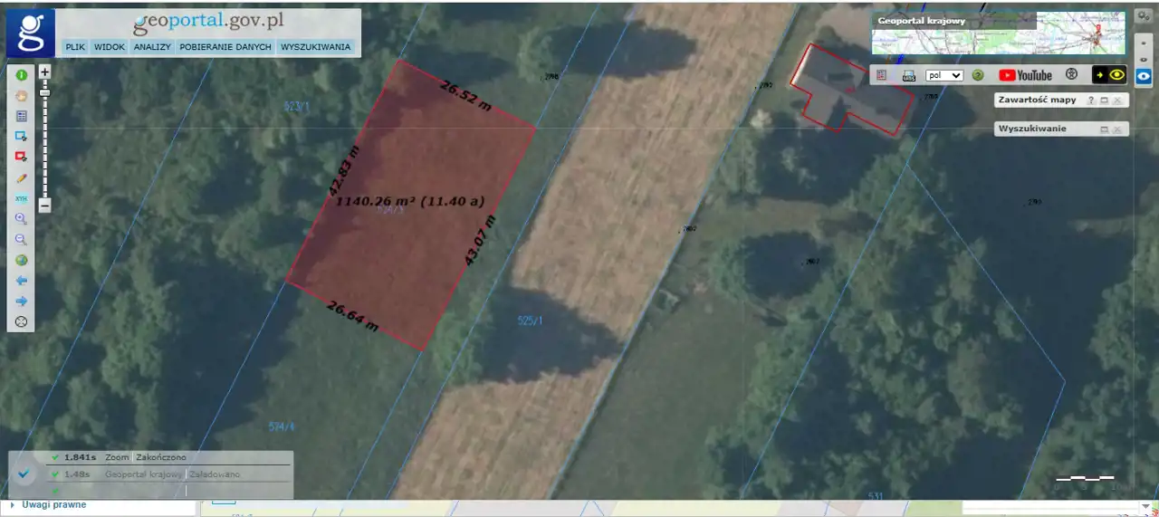 B) o pow. i 1142 m2 (wymiary: 26,5m [szer. od frontu] x 42,5m x 26,5m x 43m) w cenie 80 000 PLN,