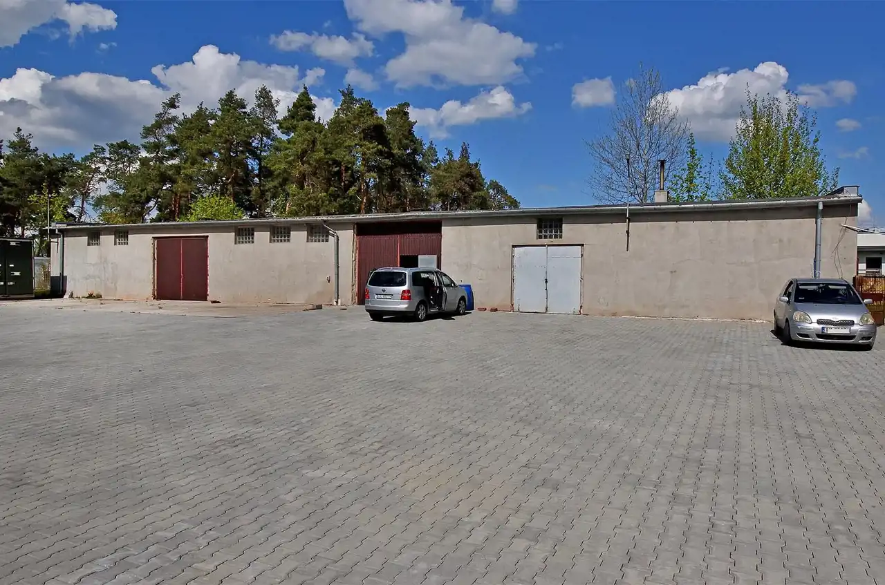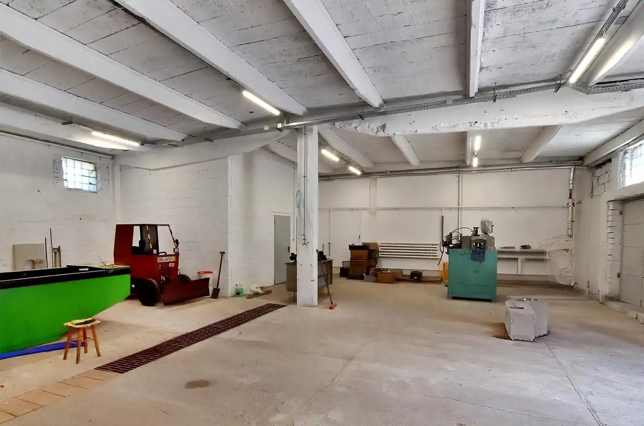 The production/storage area is approx. 320 m², plus employee social rooms, bathroom, showers, reception area, and office – total approx. 423 m² (layout can be adapted to the tenant's needs). Concrete flooring, hall height up to beams: 3.38 m.
