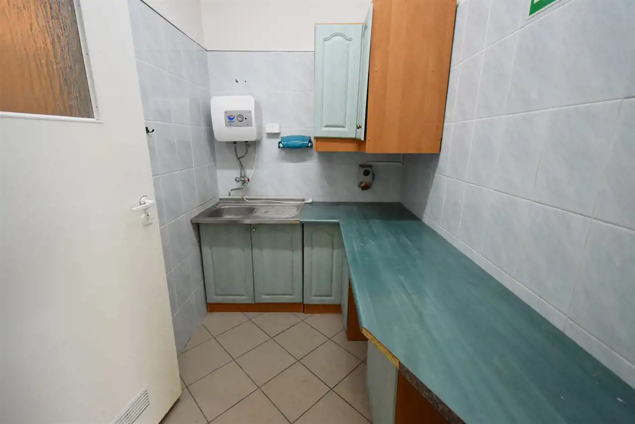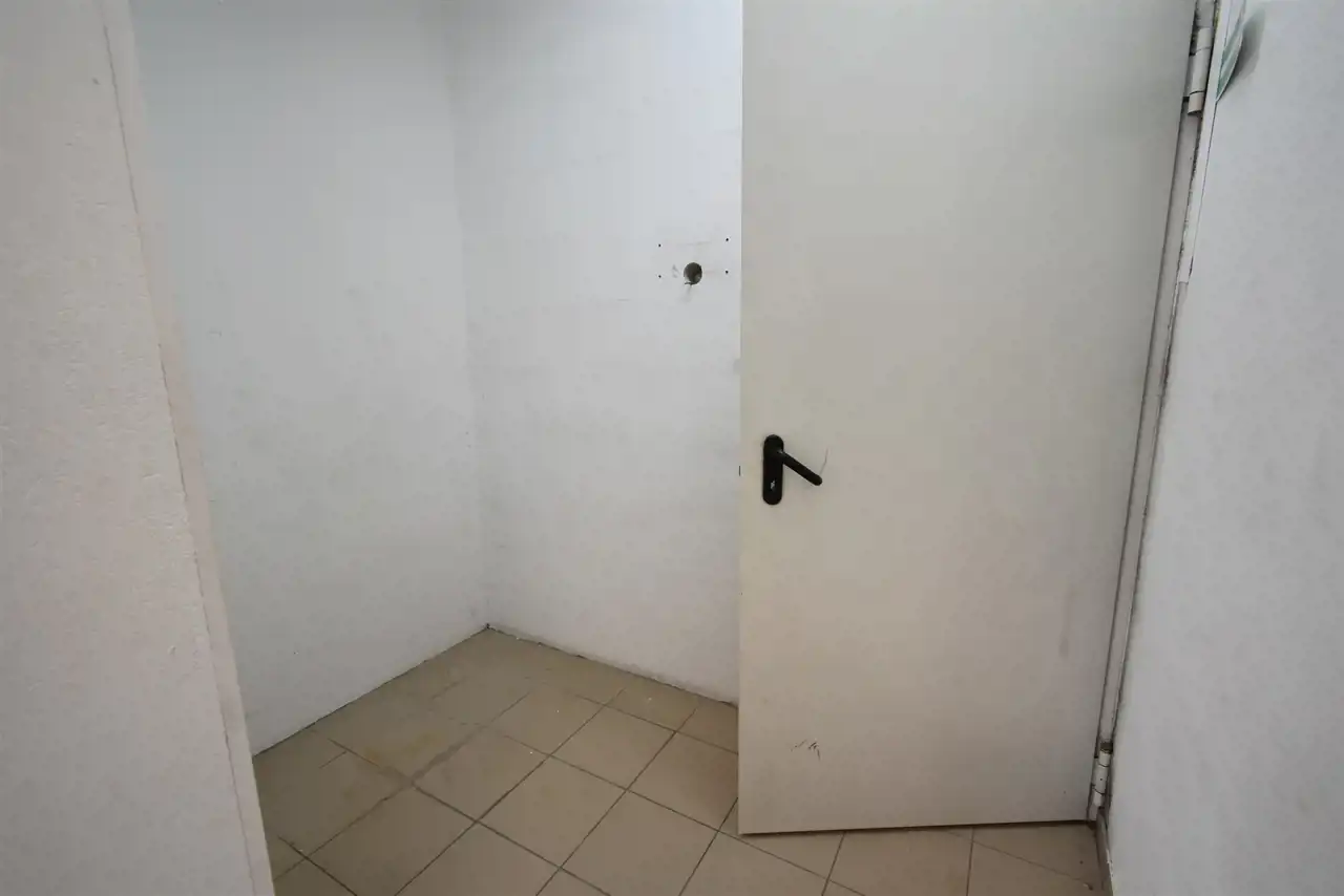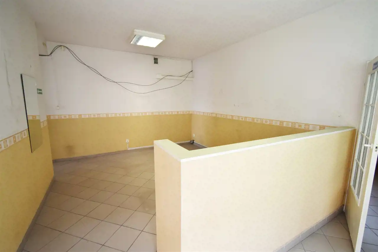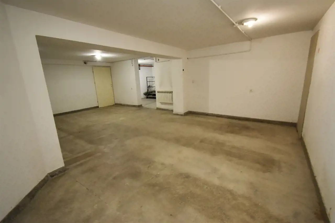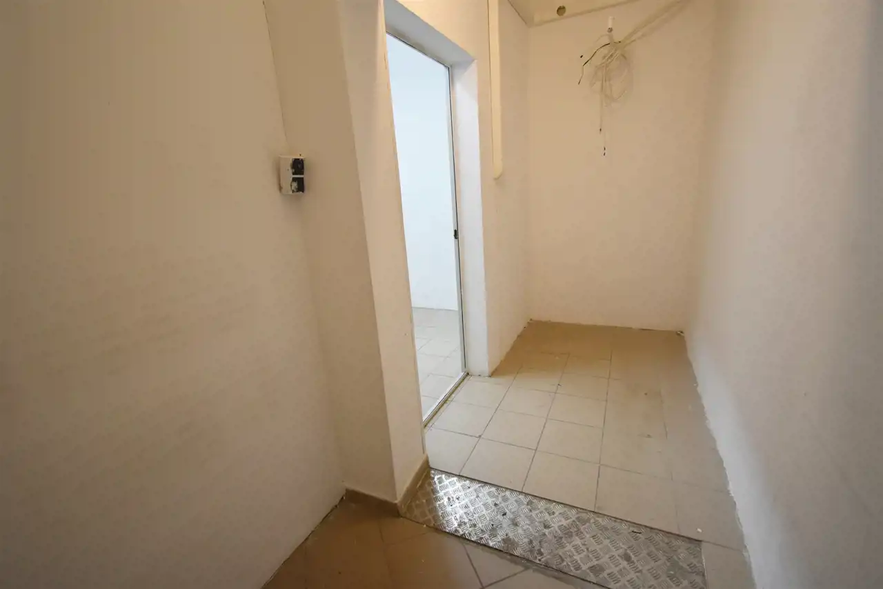 The rooms have terracotta flooring and PVC windows. The heating is powered by a pellet stove, and hot water comes from an electric water heater. The premises are equipped with anti-burglary shutters, an alarm system, and external monitoring. The room height is approximately 2.9 m. It is a corner unit with a parking lot in front of the building, accommodating around 20 cars.