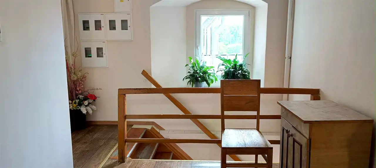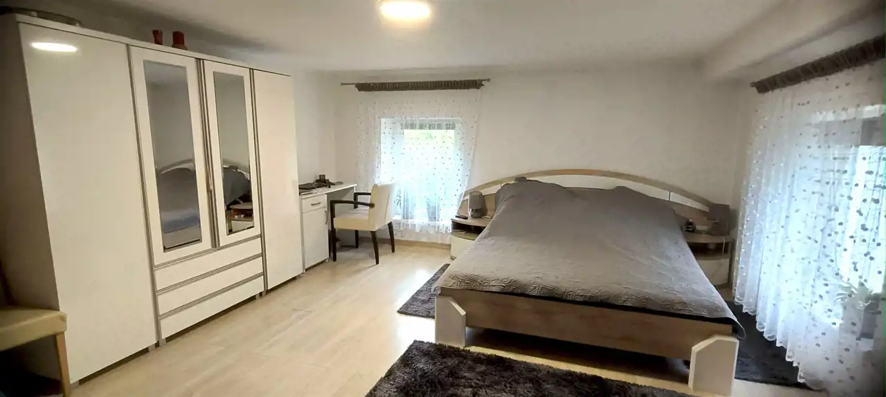 - przedpokój, kuchia, łazienka, kotłownia, salon, 2 sypialnie, spiżarka.