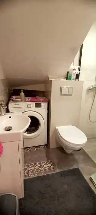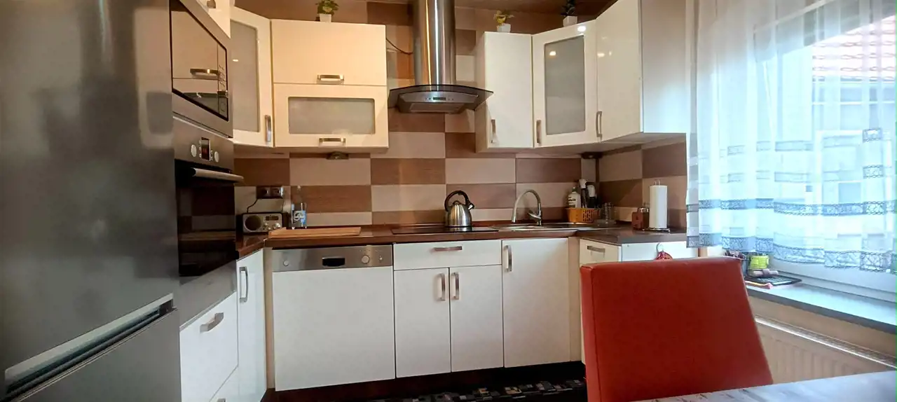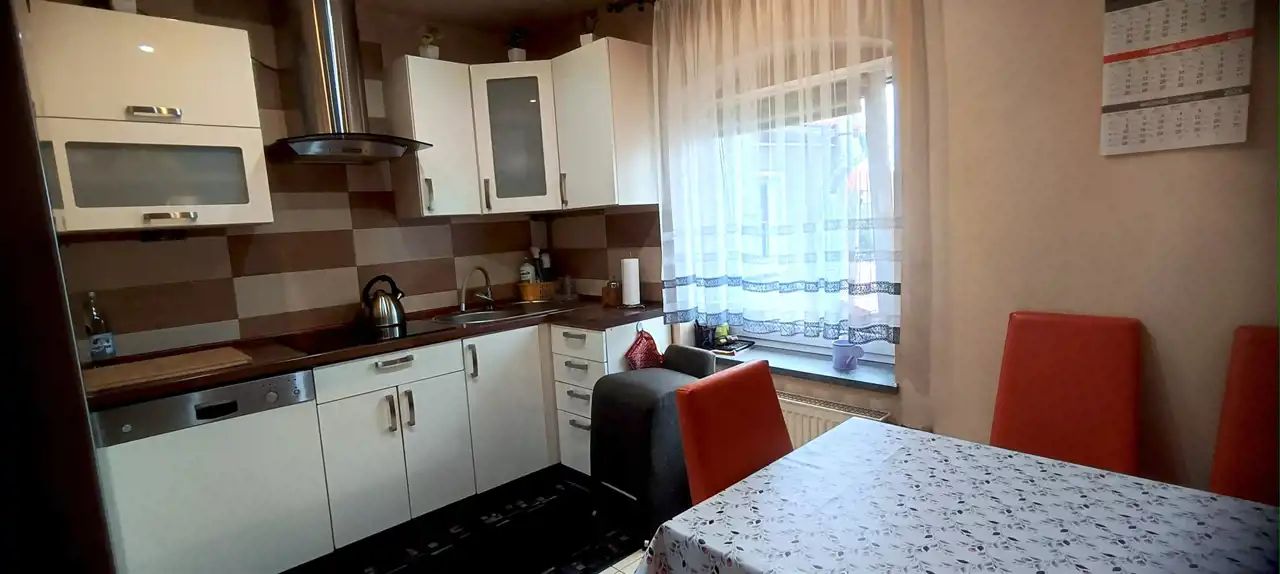 okna PCV, na podłodze panele i kafle, centralne ogrzewanie - piec na paliwo stałe. W kuchni meble w zabudowie ze sprzętem AGD ( wyposażenie kuchni wliczone jest w cenę mieszkania ). Łazienka wyposażona w kabinę prysznicową, i umywalkę.