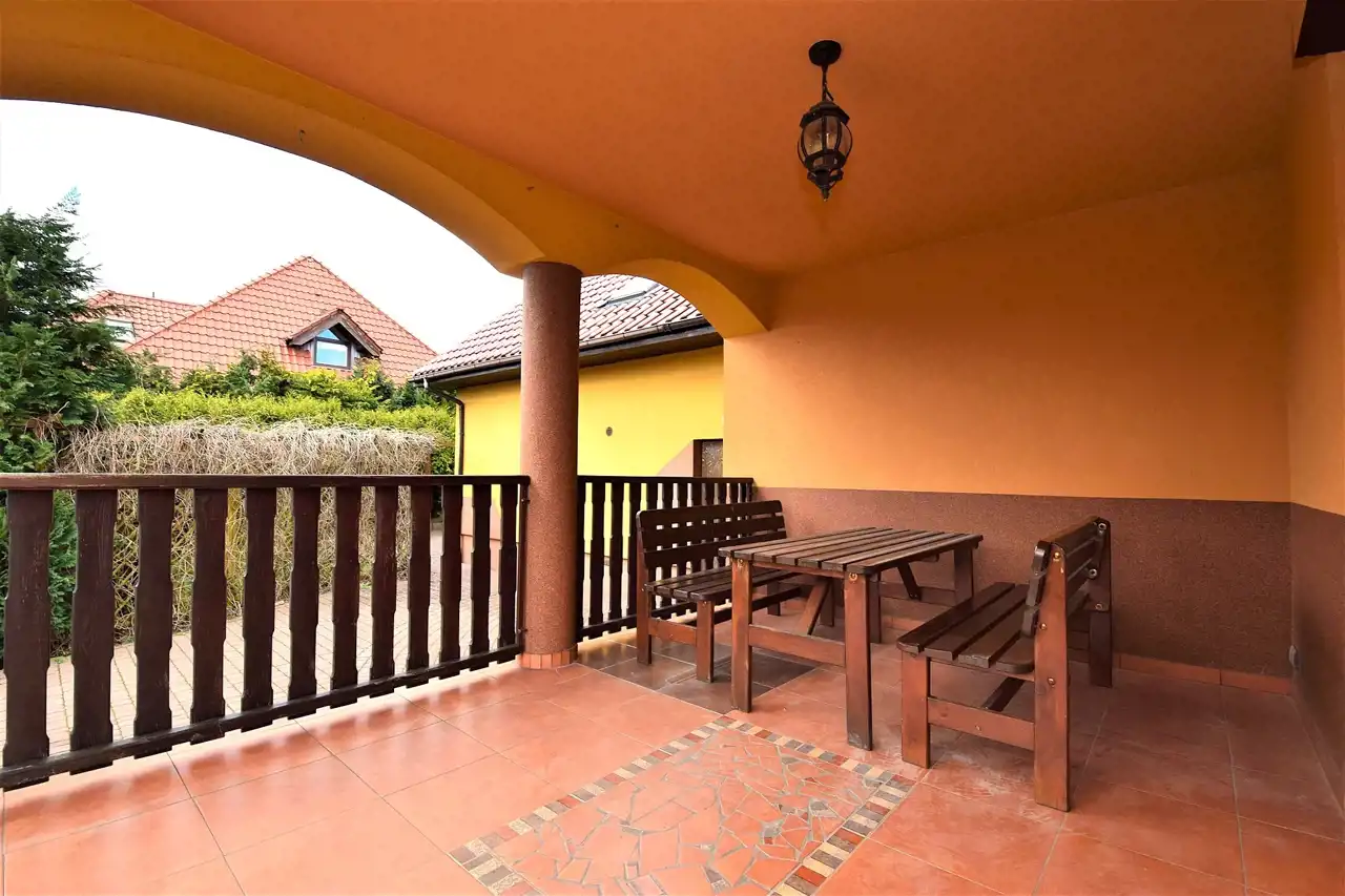 Nieruchomość posiada duży zadaszony taras z wejściem z salonu i z zejściem na ogród.