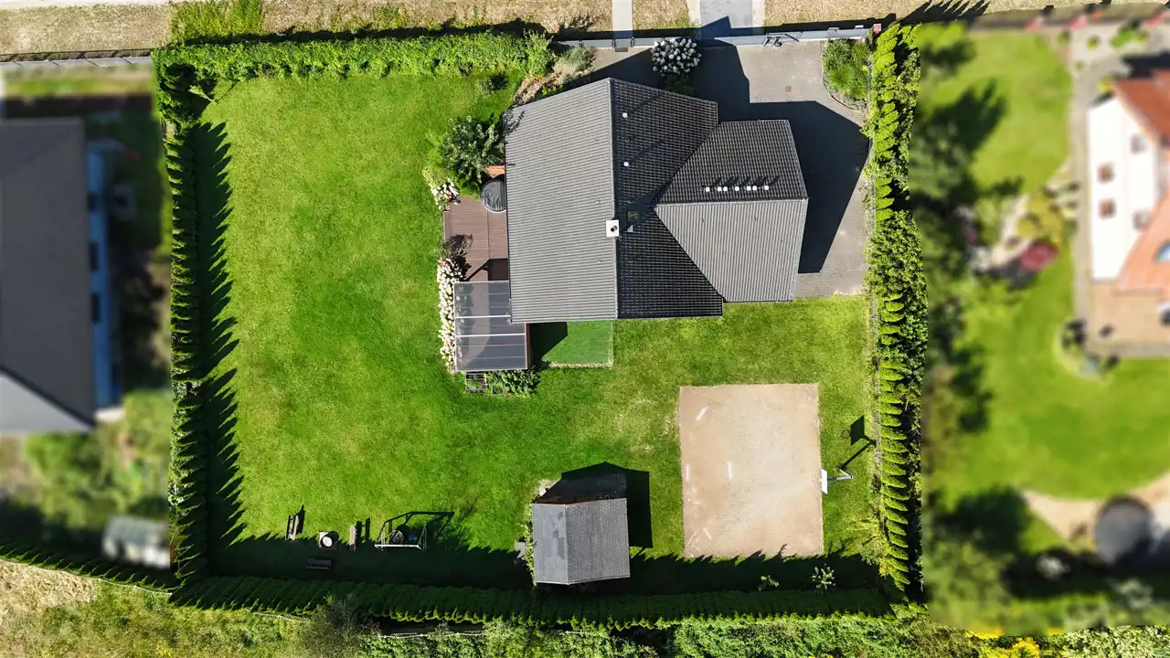 - całkowicie zagospodarowana działka 1327 m² z zadbanym ogrodem i dużym tarasem otoczonym kwiatami i krzewami,