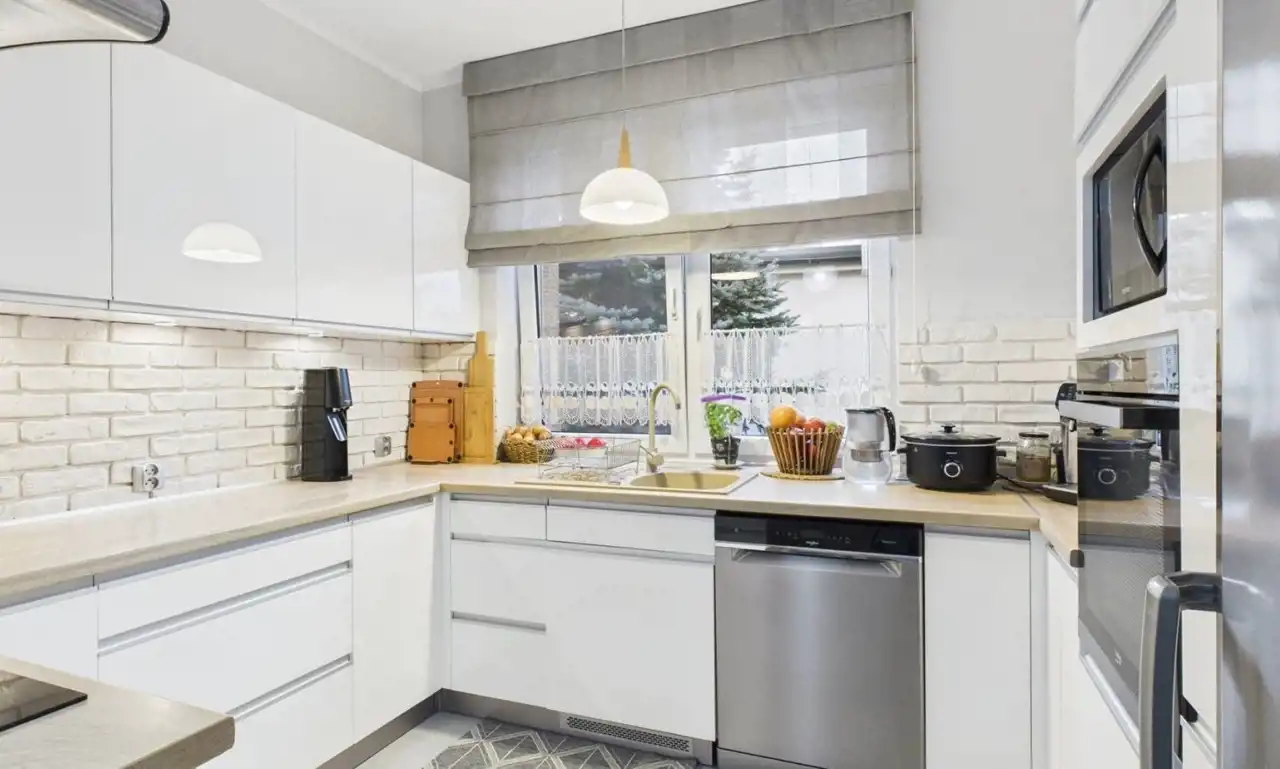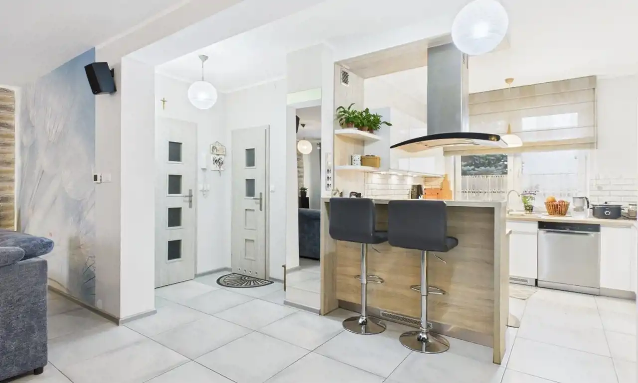 • Kuchnia otwarta na salon – 9,6 m² (zabudowa pod wymiar + sprzęt AGD w cenie)