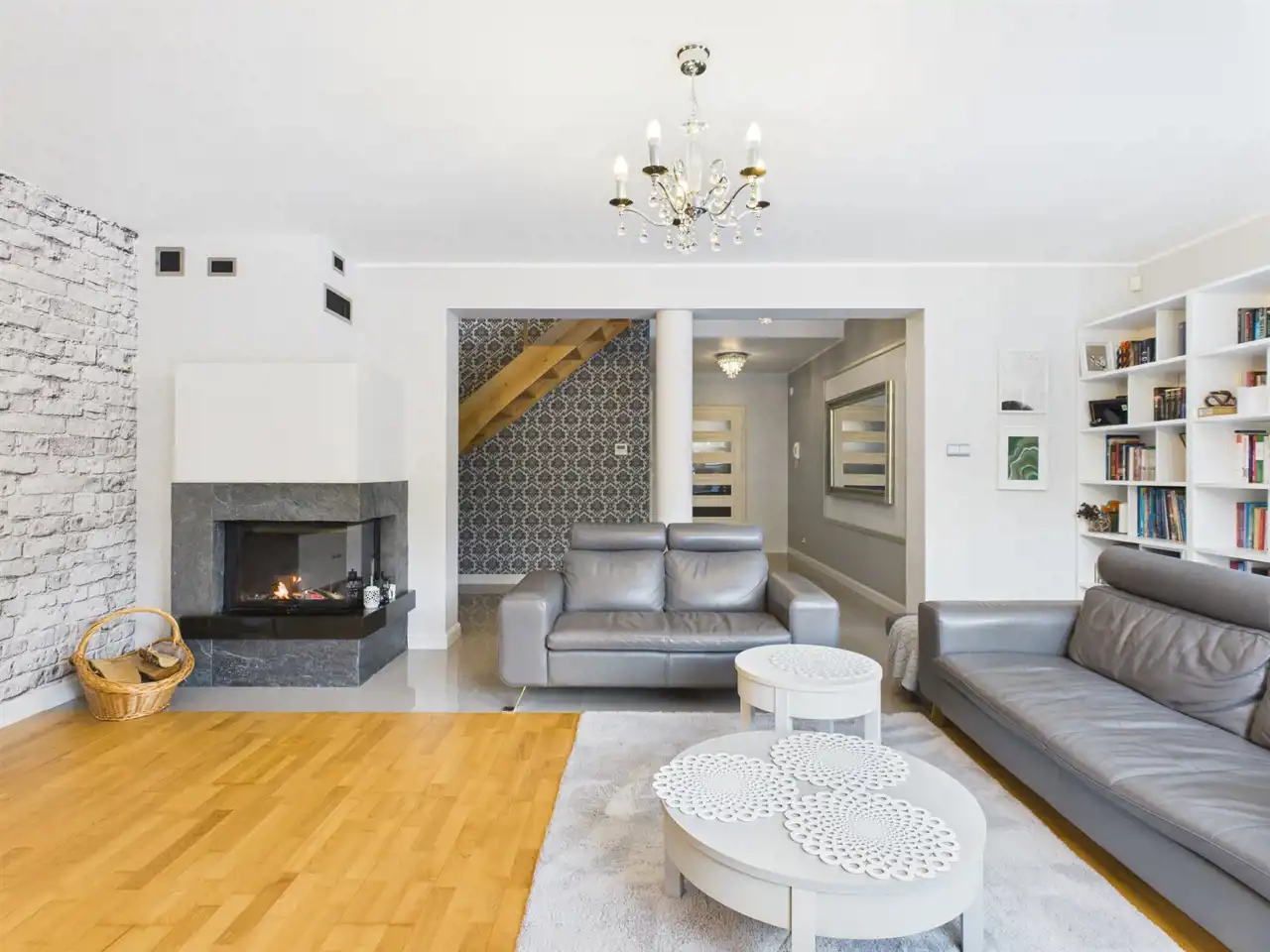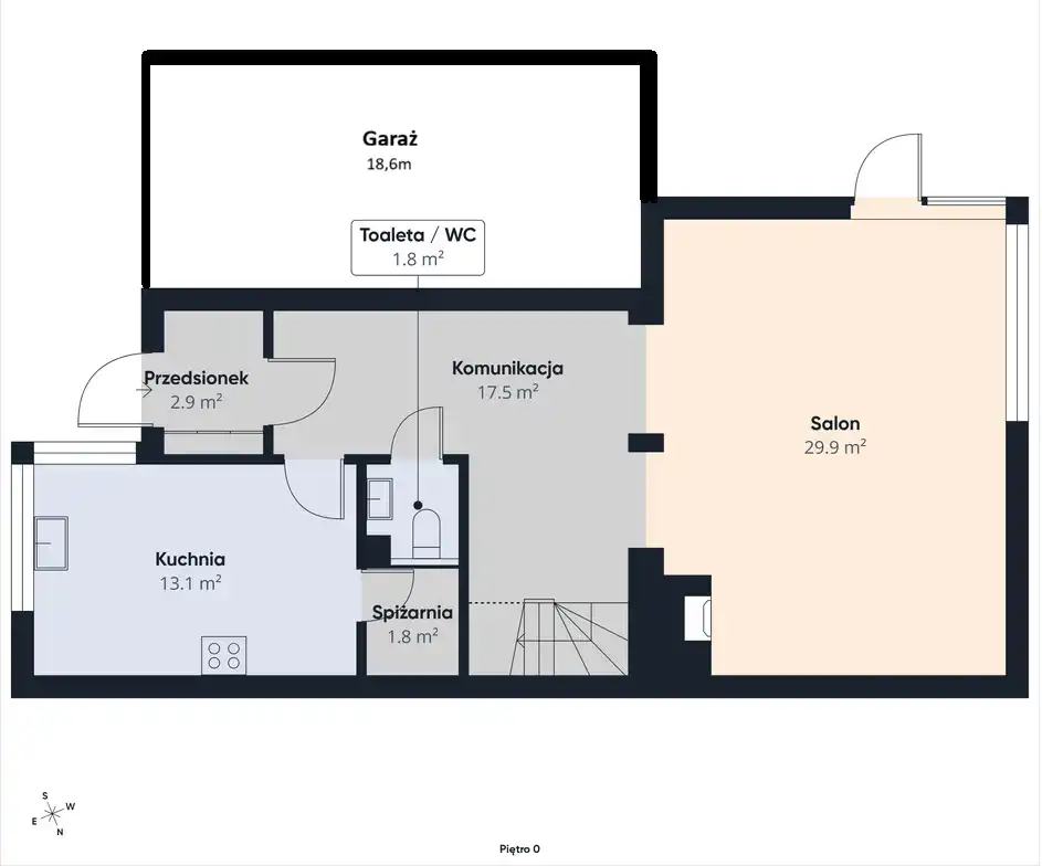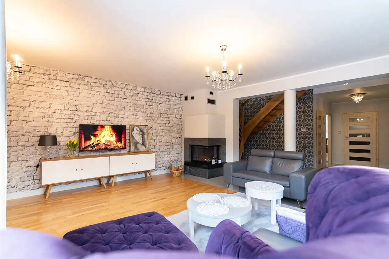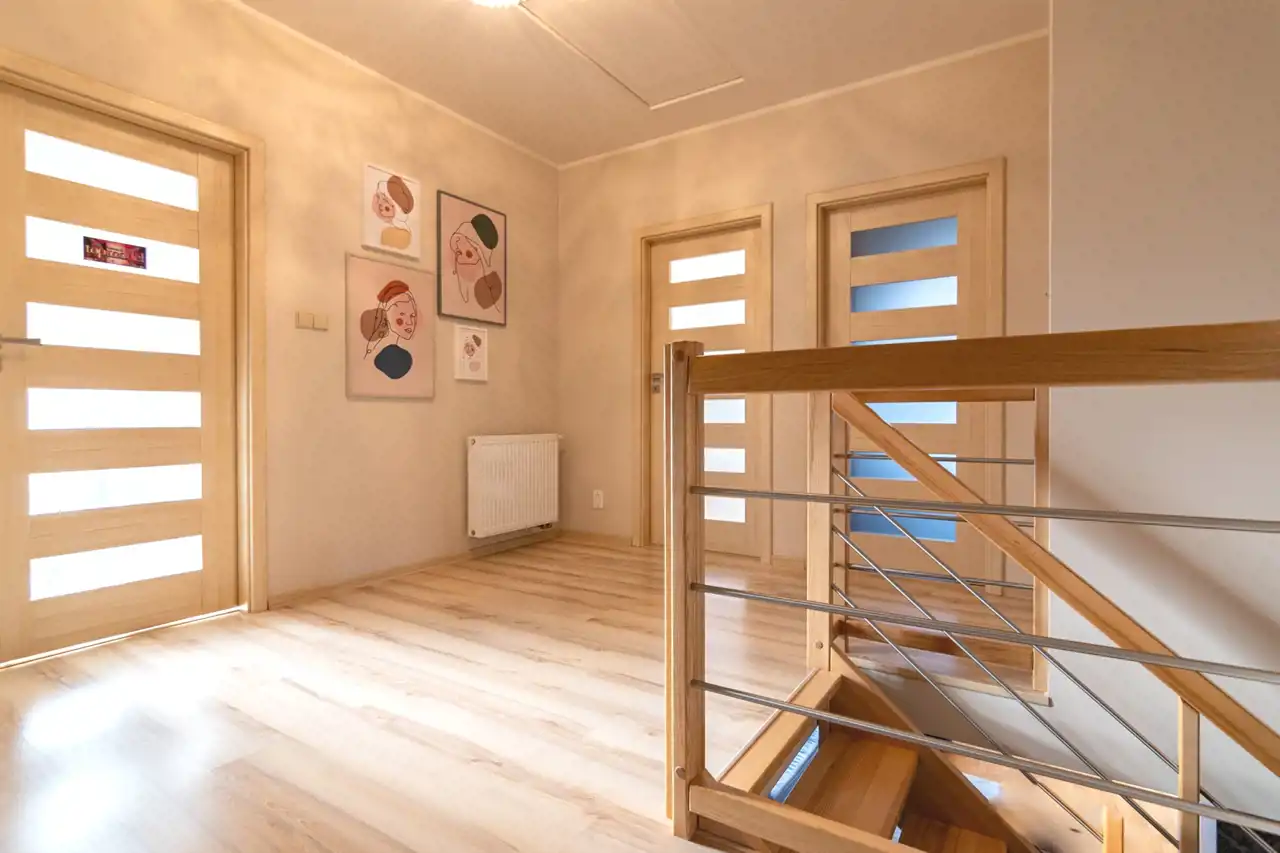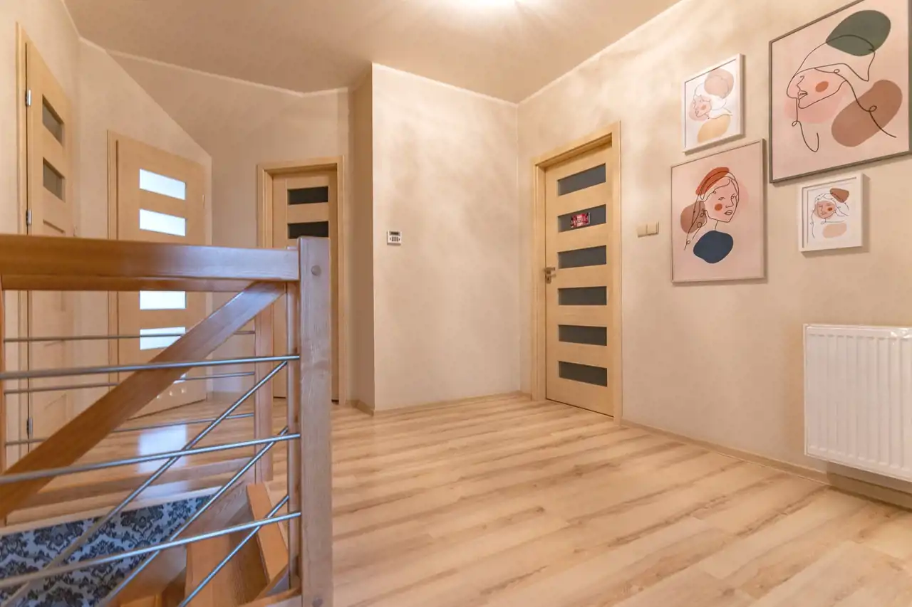 Część dzienna zlokalizowana na parterze została zaprojektowana z myślą o wygodzie domowników i naturalnym świetle. Salon z dużymi przeszkleniami płynnie łączy się z tarasem oraz wyjściem na ogród, tworząc otwartą i przyjazną przestrzeń do wypoczynku. Kominek starannie wykończony naturalnym kamieniem stanowi elegancki akcent wnętrza, a podłogi wykonane z deski barlineckiej podkreślają jego ciepły charakter. Oddzielna kuchnia, wyposażona w zabudowę meblową wykonaną na wymiar oraz sprzęt AGD, oferując wygodną przestrzeń do codziennego użytkowania. Dodatkowym udogodnieniem jest spiżarnia, zapewniająca praktyczne miejsce do przechowywania. Na parterze znajduje się również WC, wiatrołap oraz przestronny przedpokój z wygodnymi i praktycznymi schodami prowadzącymi na piętro.