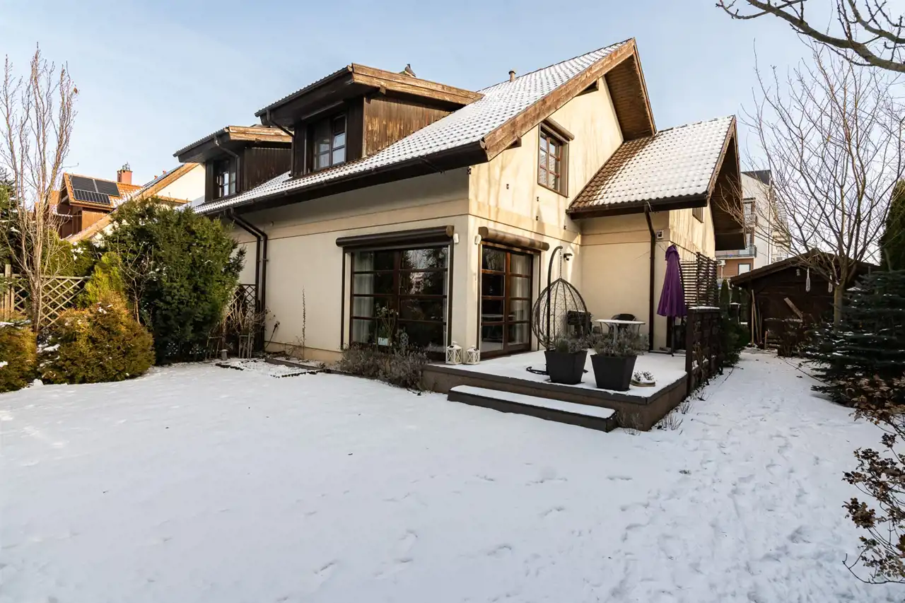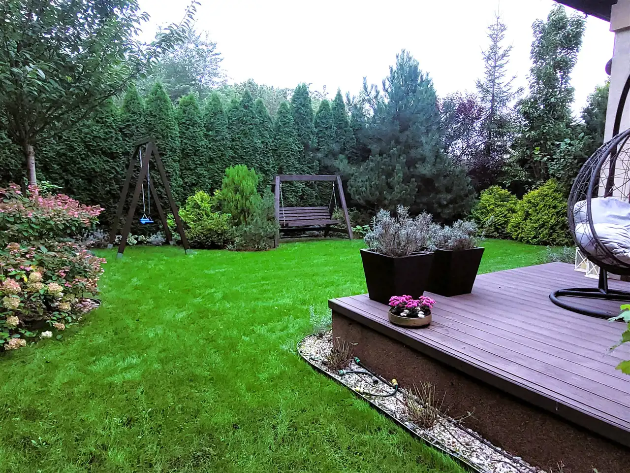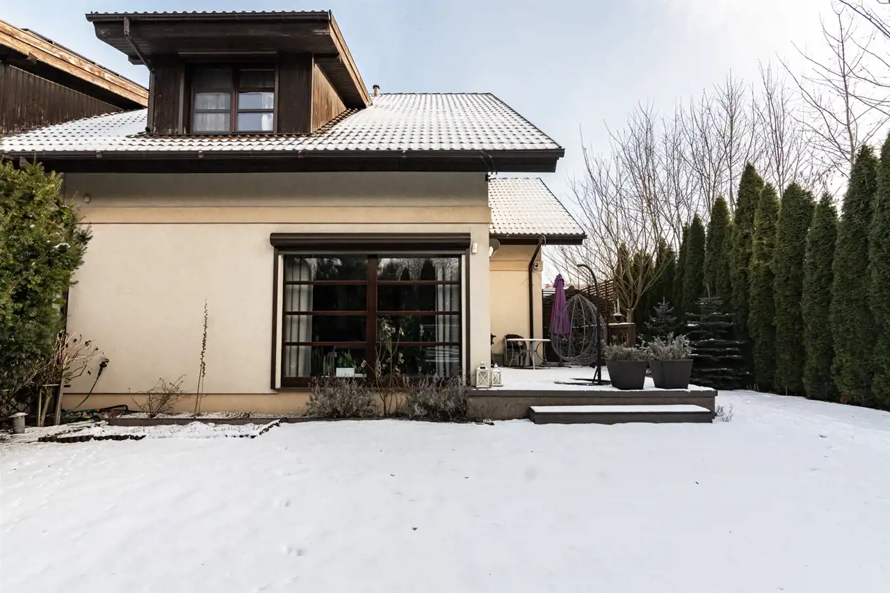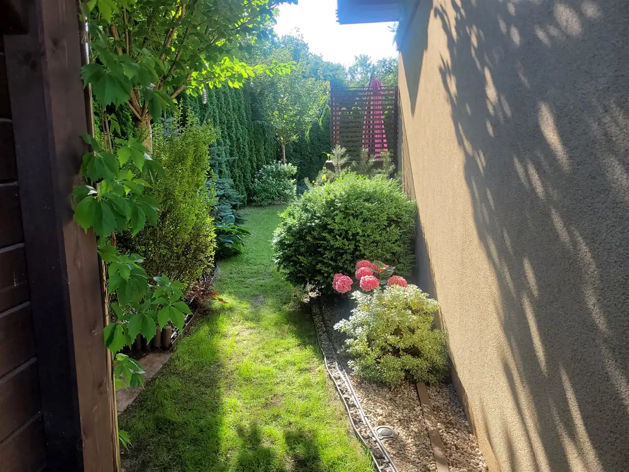 Starannie urządzony ogród stanowi idealne miejsce do wypoczynku i spędzania czasu na świeżym powietrzu. Taras z deski kompozytowej oraz wieloletnia roślinność zapewniają pełną prywatność. Do dyspozycji właścicieli pozostają dwa garaże z automatyczną bramą na pilota oraz miejsca postojowe przed budynkiem.
