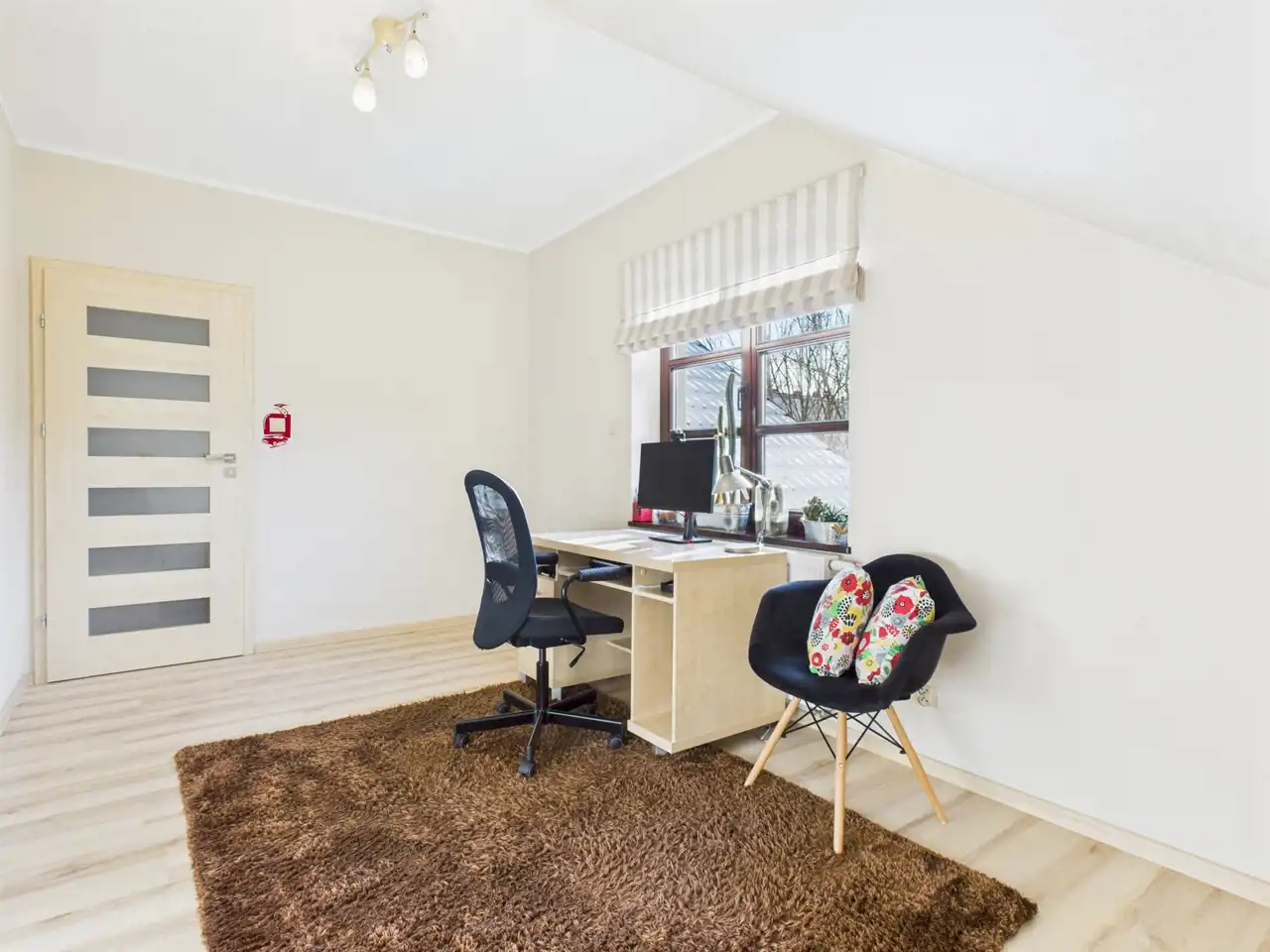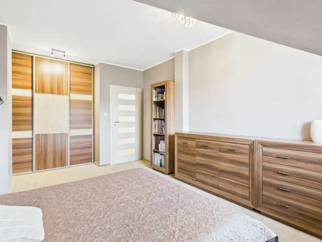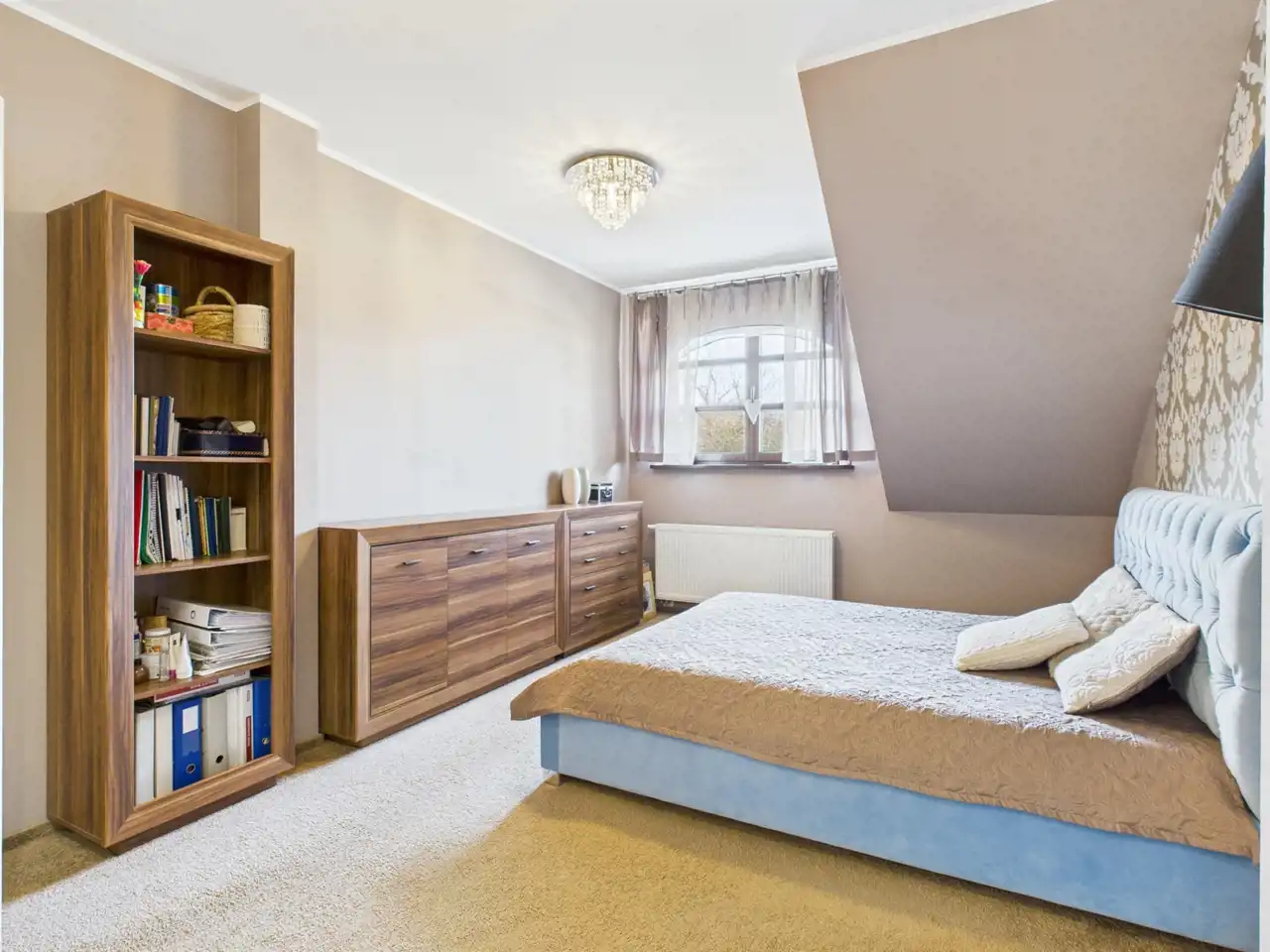 Piętro domu stanowi komfortową strefę prywatną. Znajdują się tu trzy pokoje, w tym sypialnia główna z pojemną 3- drzwiową szafą, gabinet oraz pokój dziecięcy. Pokoje na piętrze bardzo jasne z południową i zachodnią wystawą okien co zapewnia naturalne doświetlenie wnętrz. Do dyspozycji domowników jest przestronna łazienka z oknem, wyposażona zarówno w wannę, jak i prysznic, 2 umywalki, WC oraz bidet. Dodatkowo na piętrze znajduje się osobna garderoba oraz pralnia połączona z kotłownią.