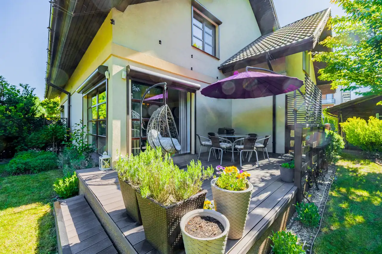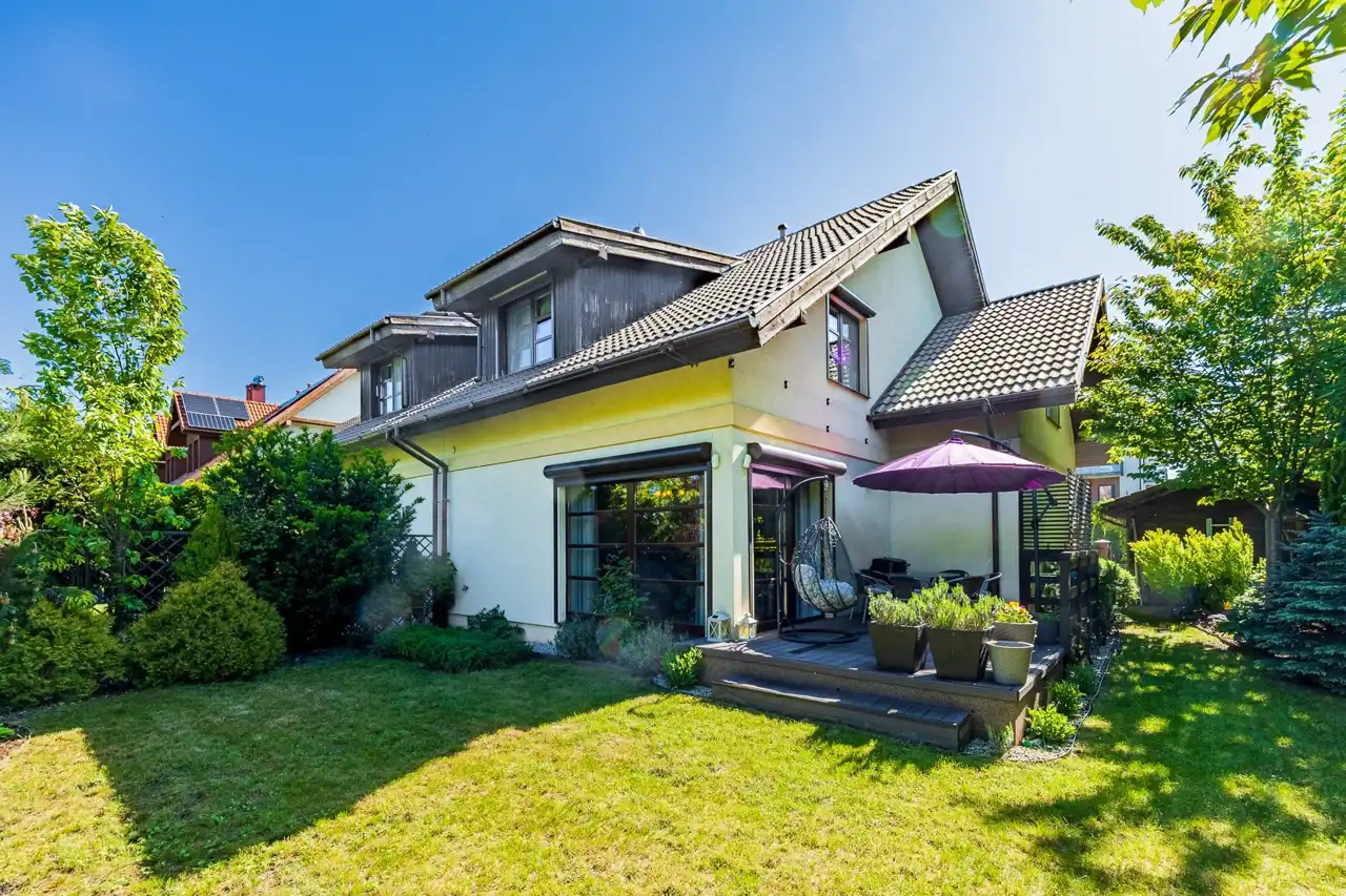Mamy przyjemność zaprezentować wyjątkowy dom na sprzedaż w zabudowie bliźniaczej o powierzchni użytkowej 168,18 m², położony na w pełni zagospodarowanej działce o powierzchni 393 m², z dwoma garażami oraz kameralnym, pięknie zagospodarowanym ogrodem. Dom parterowy z poddaszem użytkowym, niepodpiwniczony.