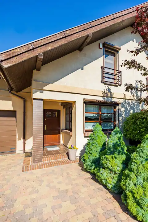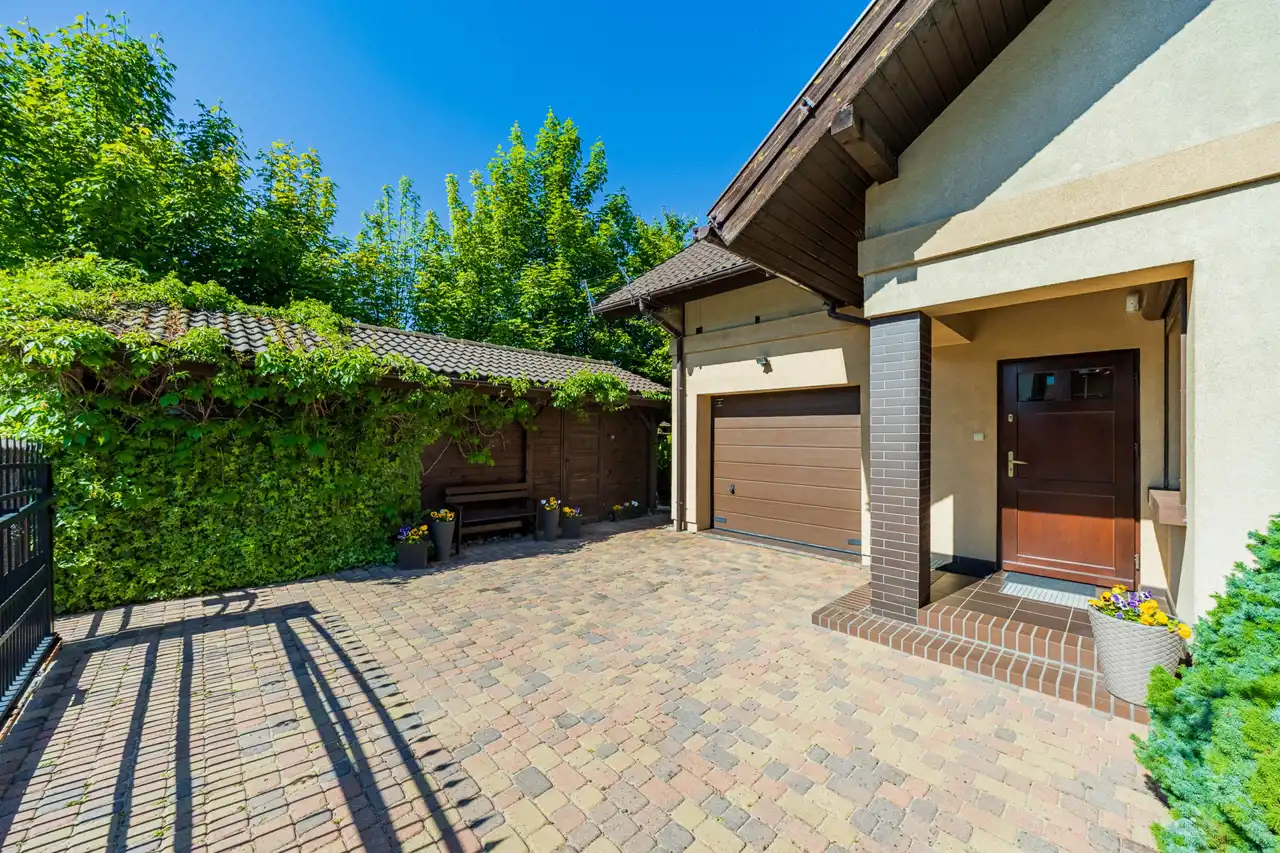 Przed frontem budynku znajduje się dobrze utrzymany polbruk, który tworzy dodatkowe, wygodne miejsca postojowe, umożliwiające parkowanie bez konieczności wjazdu do garażu.