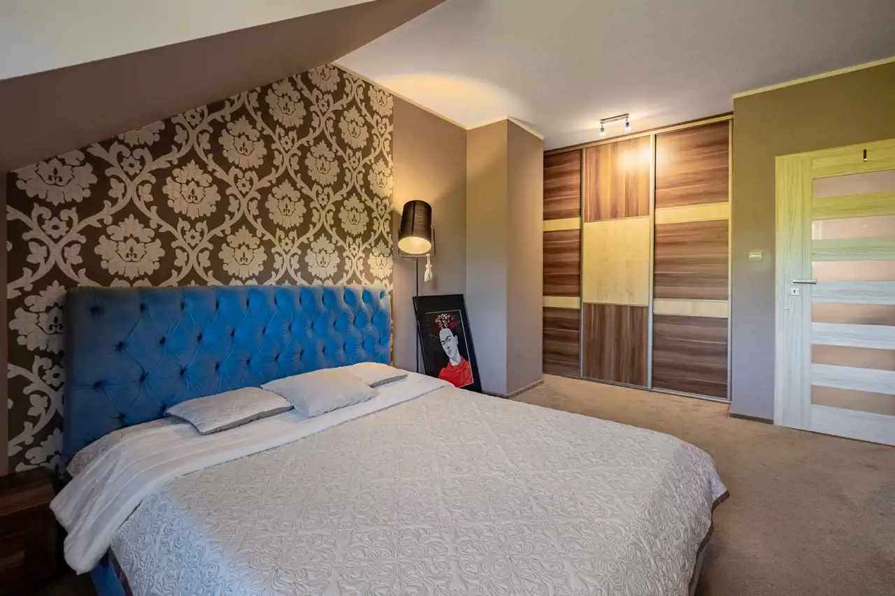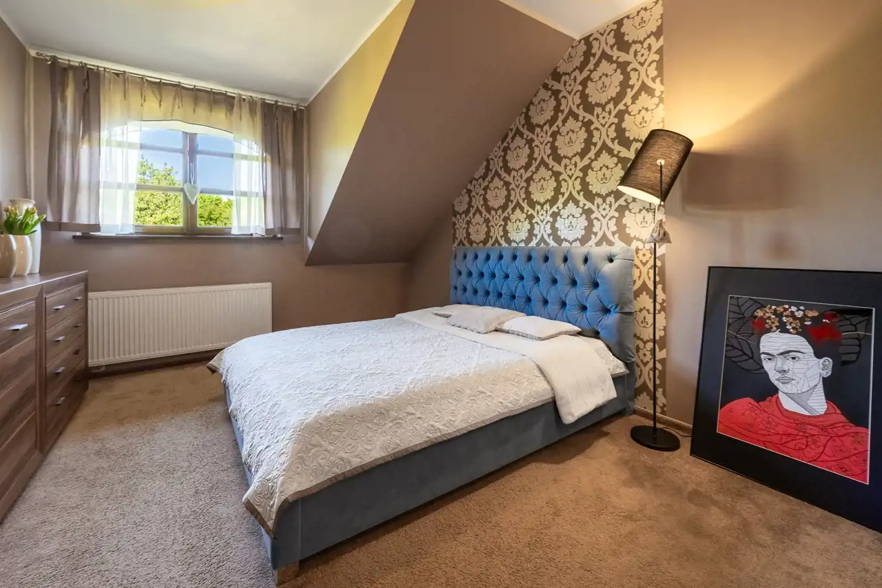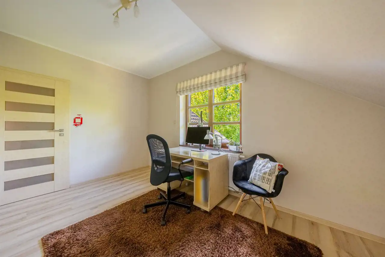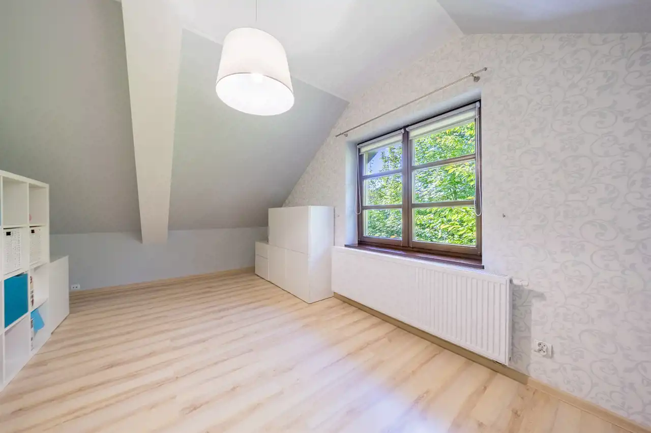 Na piętrze usytuowane są trzy pokoje: przestronna sypialnia wyłożona miękką, komfortową wykładziną, wyposażona w dużą szafę w zabudowie oraz dwa pokoje dziecięce zlokalizowane od strony ogrodu – z widokiem na kwitnące drzewa, zapewniające naturalne światło i kojącą zieleń za oknem. Do dyspozycji domowników jest również duża, jasna łazienka z wysokim oknem, wyposażona w prysznic, wannę, WC oraz bidet. Dodatkowo na piętrze znajduje się oddzielna garderoba z regałami oraz pralnia połączona z kotłownią, w której zainstalowano nowoczesny piec gazowy.