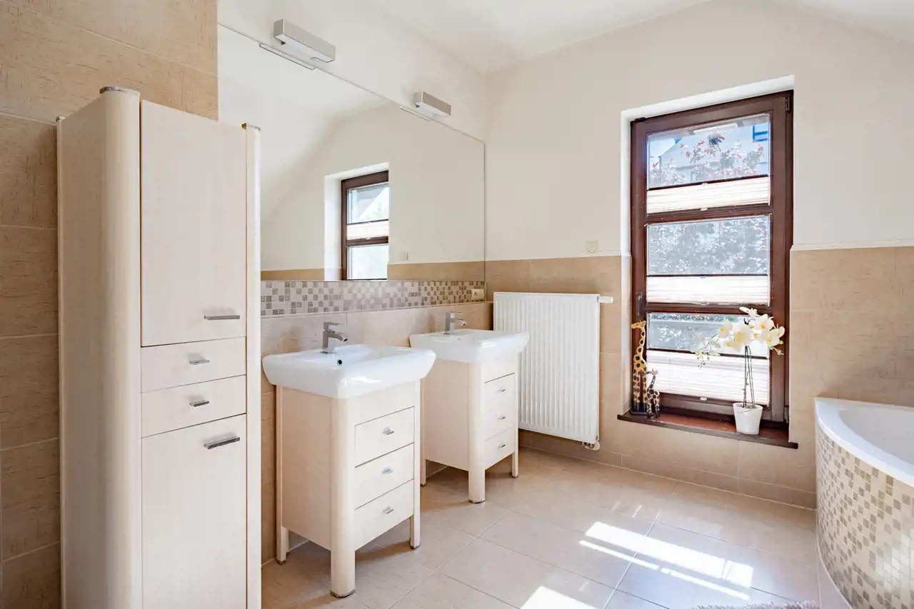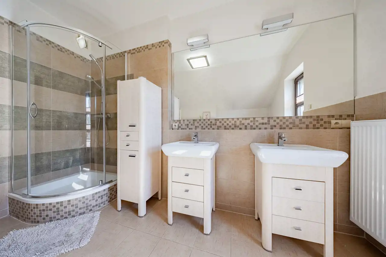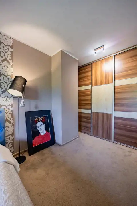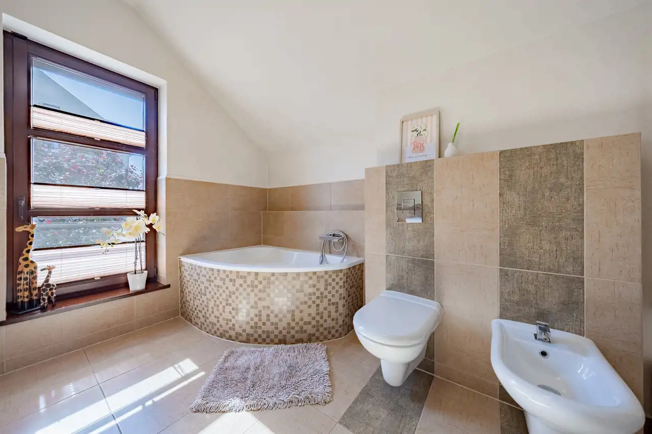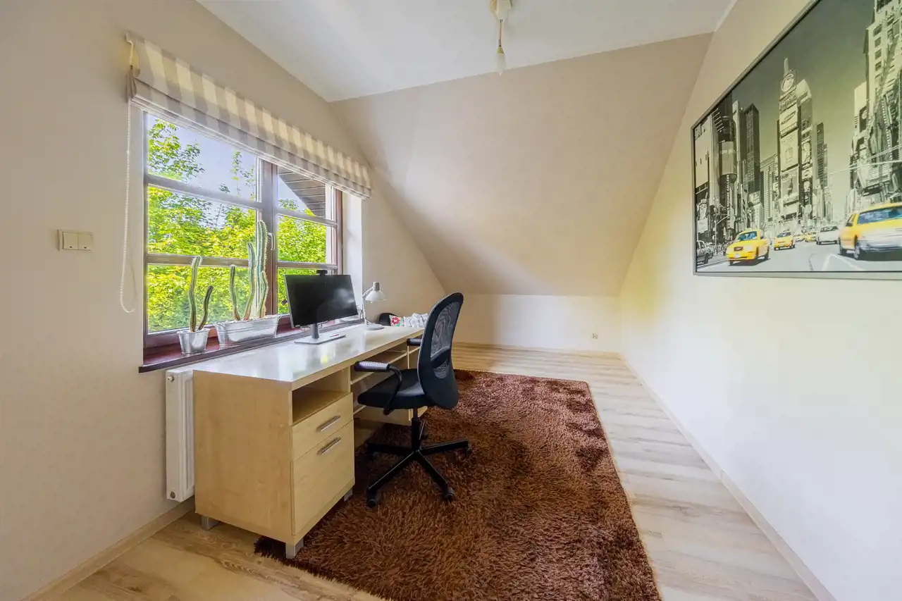 Na piętrze usytuowane są trzy pokoje: przestronna sypialnia wyłożona miękką, komfortową wykładziną, wyposażona w dużą szafę w zabudowie oraz dwa pokoje dziecięce zlokalizowane od strony ogrodu – z widokiem na kwitnące drzewa, zapewniające naturalne światło i kojącą zieleń za oknem. Do dyspozycji domowników jest również duża, jasna łazienka z wysokim oknem, wyposażona w prysznic, wannę, WC oraz bidet. Dodatkowo na piętrze znajduje się oddzielna garderoba z regałami oraz pralnia połączona z kotłownią, w której zainstalowano nowoczesny piec gazowy.