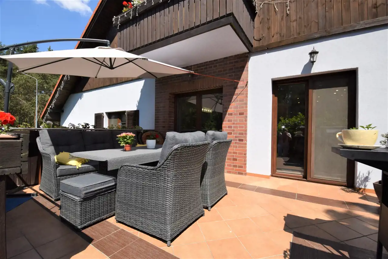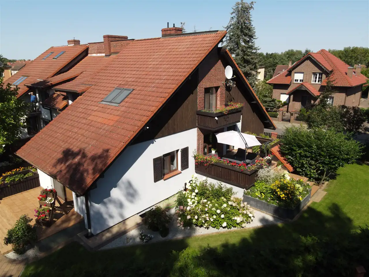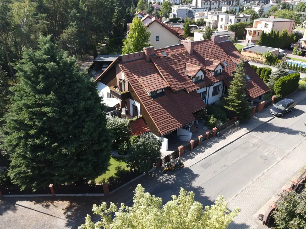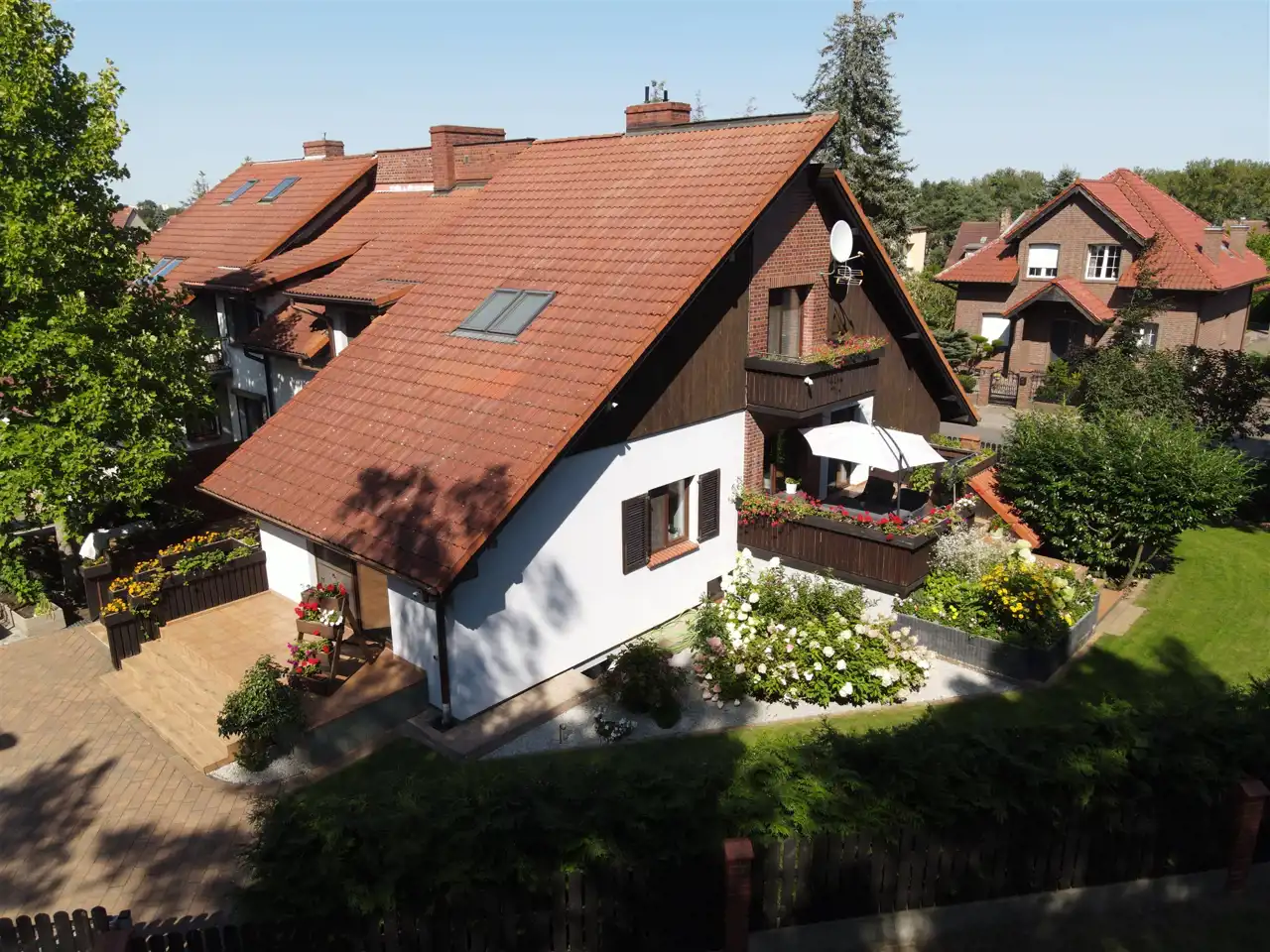 Dach kryty dachówką. Okna PCV. Dwa tarasy z funkcją wypoczynkową + trzeci "gospodarczy".