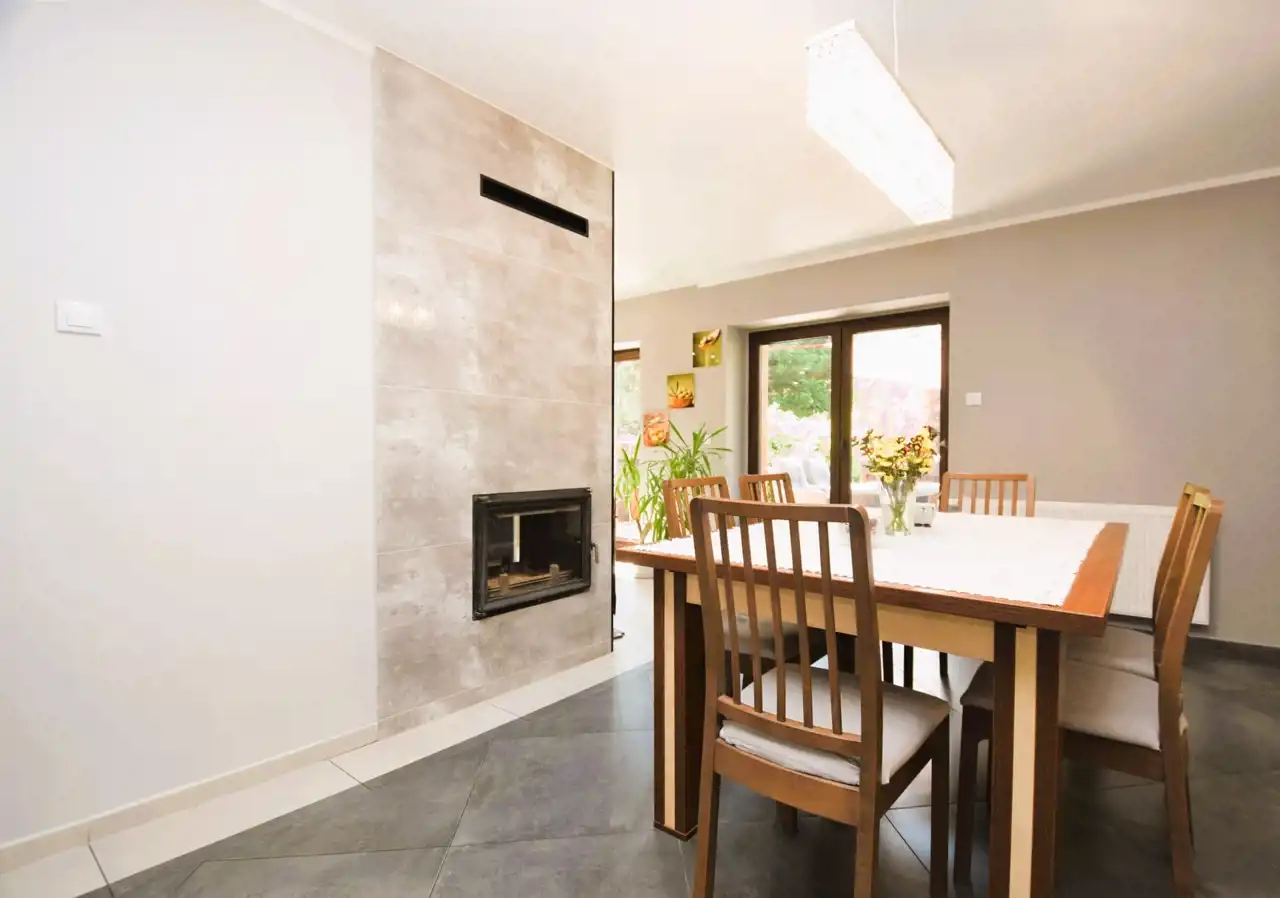 - jadalnia o pow. 17 m2, z wyjściem na taras, jadalnię od kuchni oddziela kominek oraz podświetlone witryny