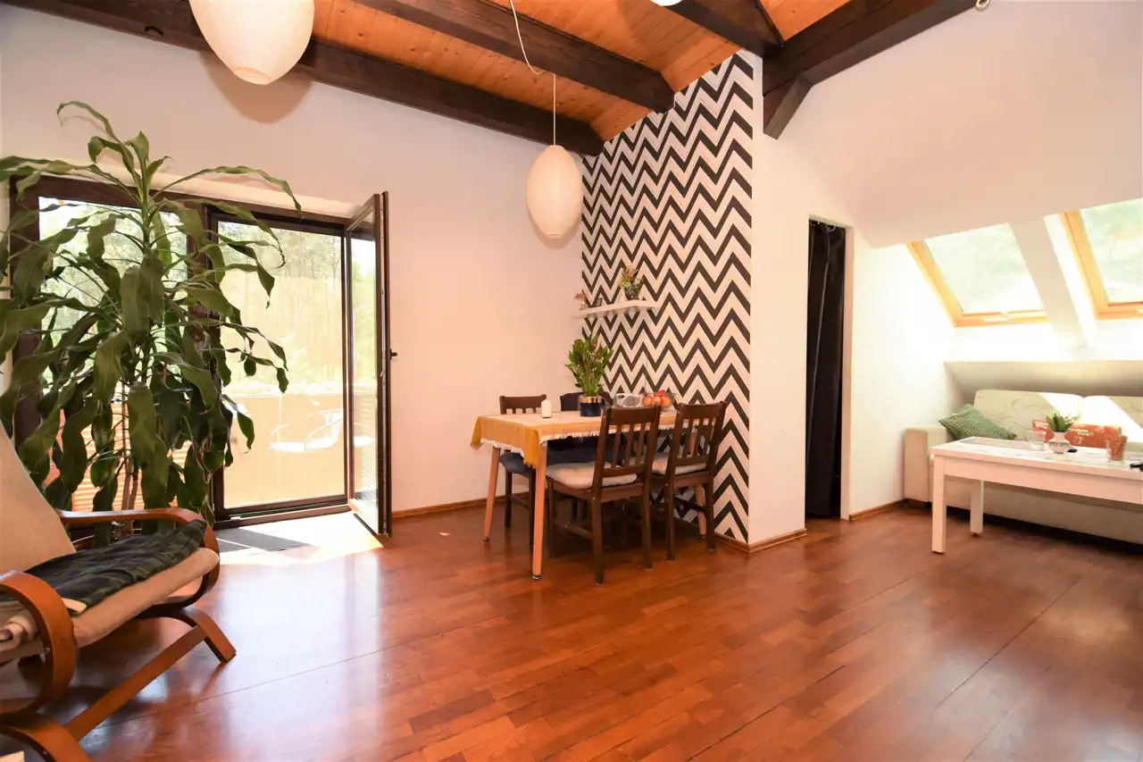 - salon 26 m2 (wysokość 3,10 m) z wyjściem na taras