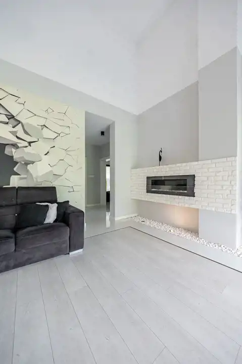 Na podłogach w salonie, kuchni i korytarzu zastosowano duże, spójne kafle, które dodają elegancji i nowoczesnego charakteru.