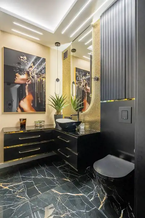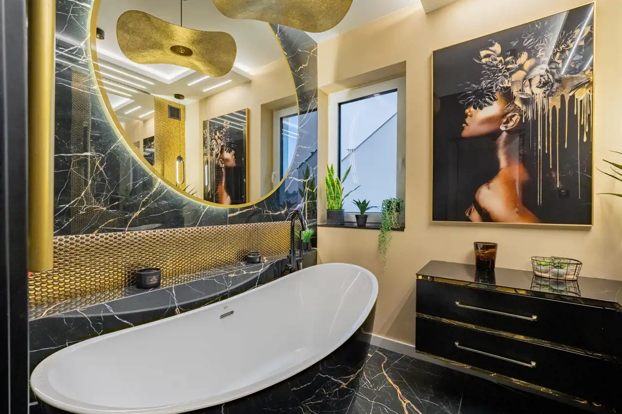 - Wyrafinowana sypialnia – wykończona w czerni i złocie z dużą oszkloną szafą,