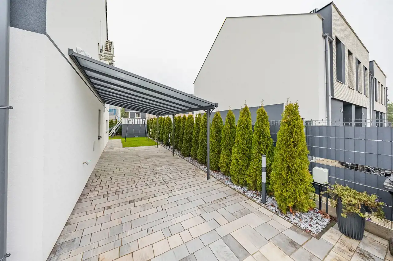 - Zagospodarowany ogród z dużymi nasadzeniami: Zielona ściana z 70 tui oraz trzy majestatyczne 3-metrowe drzewa tworzą intymną atmosferę.
