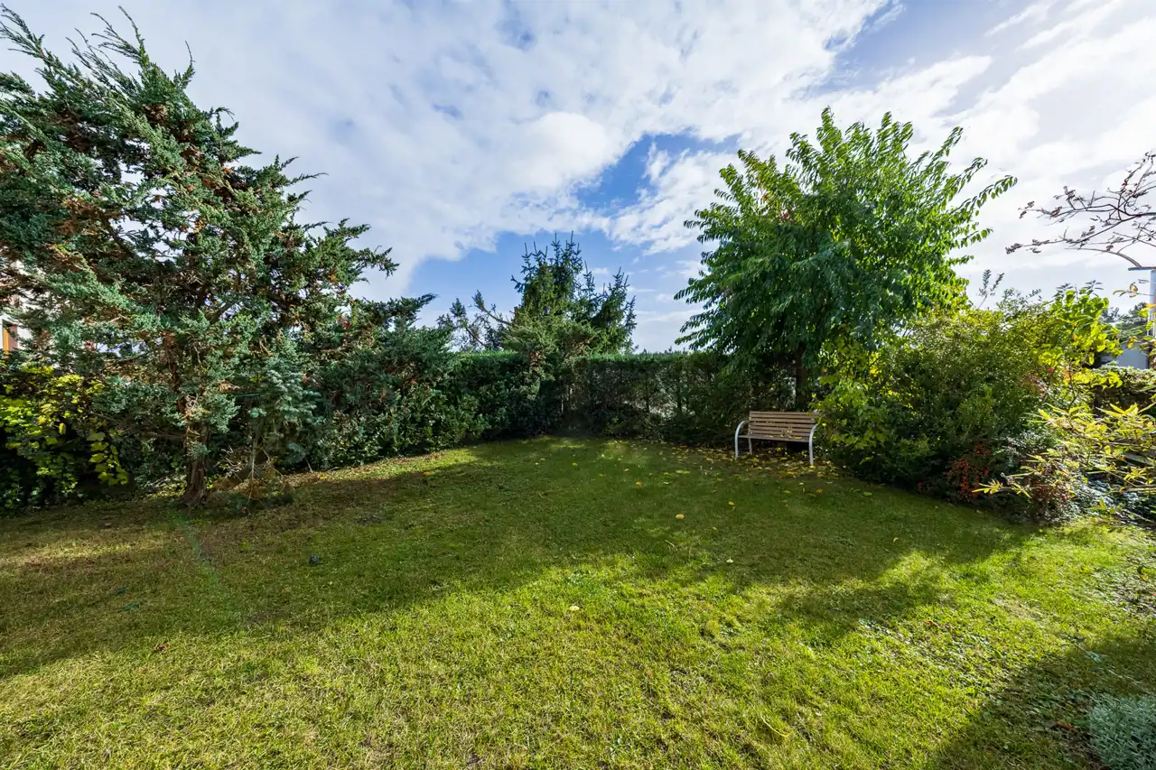 - Zadbany ogród z tyłu posesji – trawa, drzewa i krzewy ozdobne