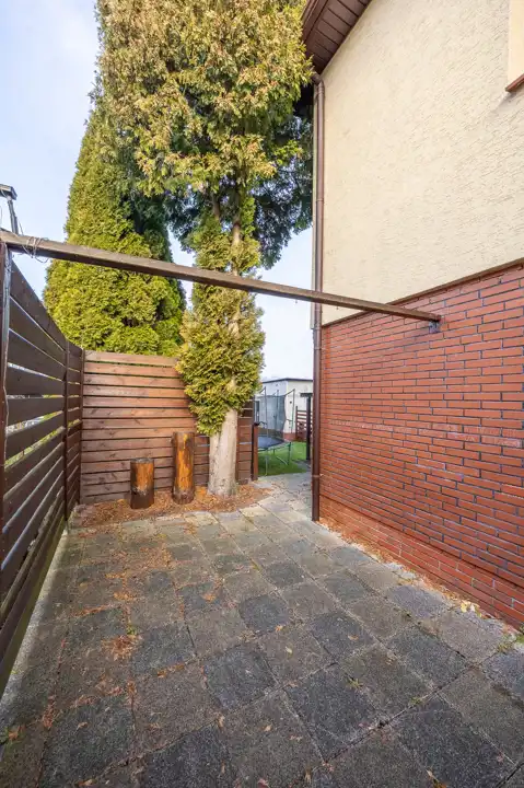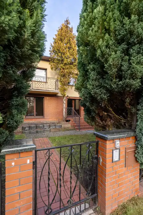 - Ogrodzenie: ozdobne kute na klinkierowej podmurówce, wzdłuż działki tuje