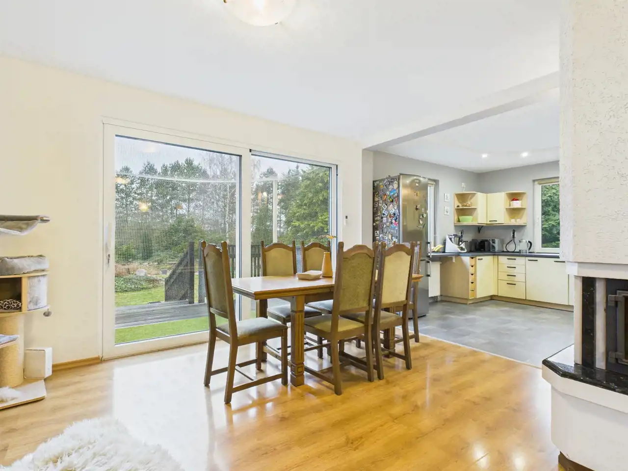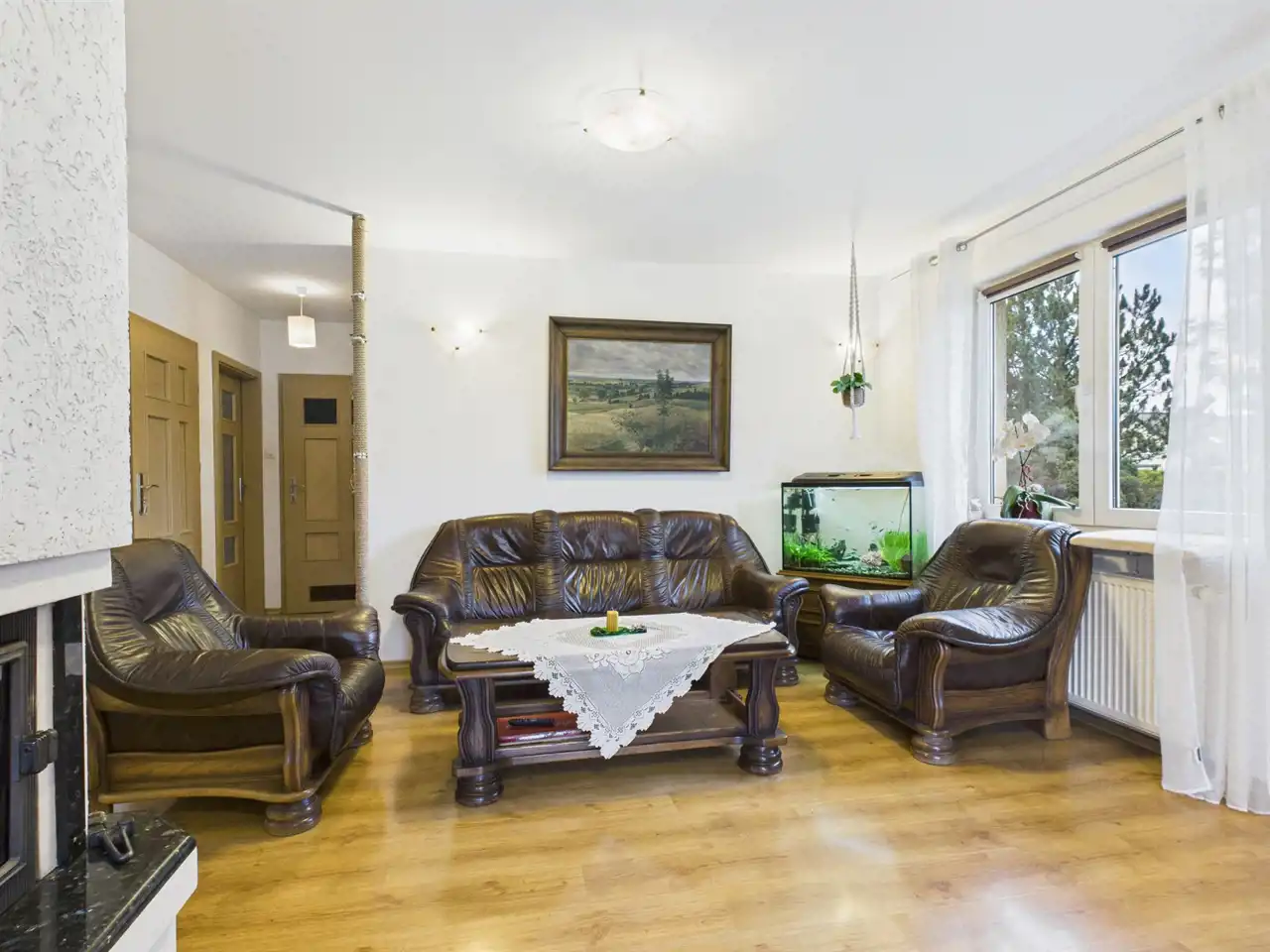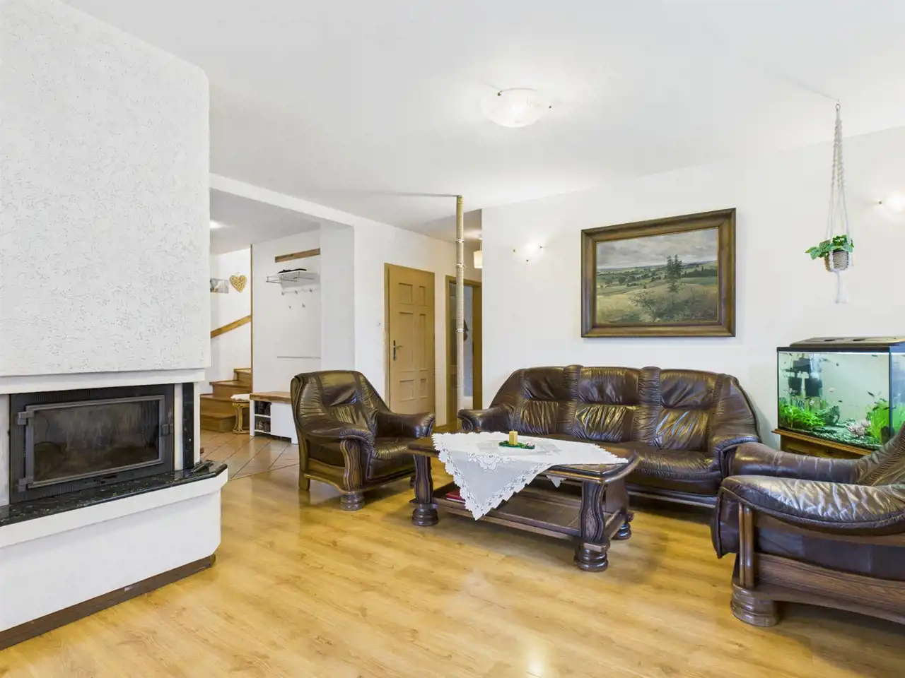 - przestronny salon o pow. ok. 33,5 m2 z kominkiem posiadającym rozprowadzenie