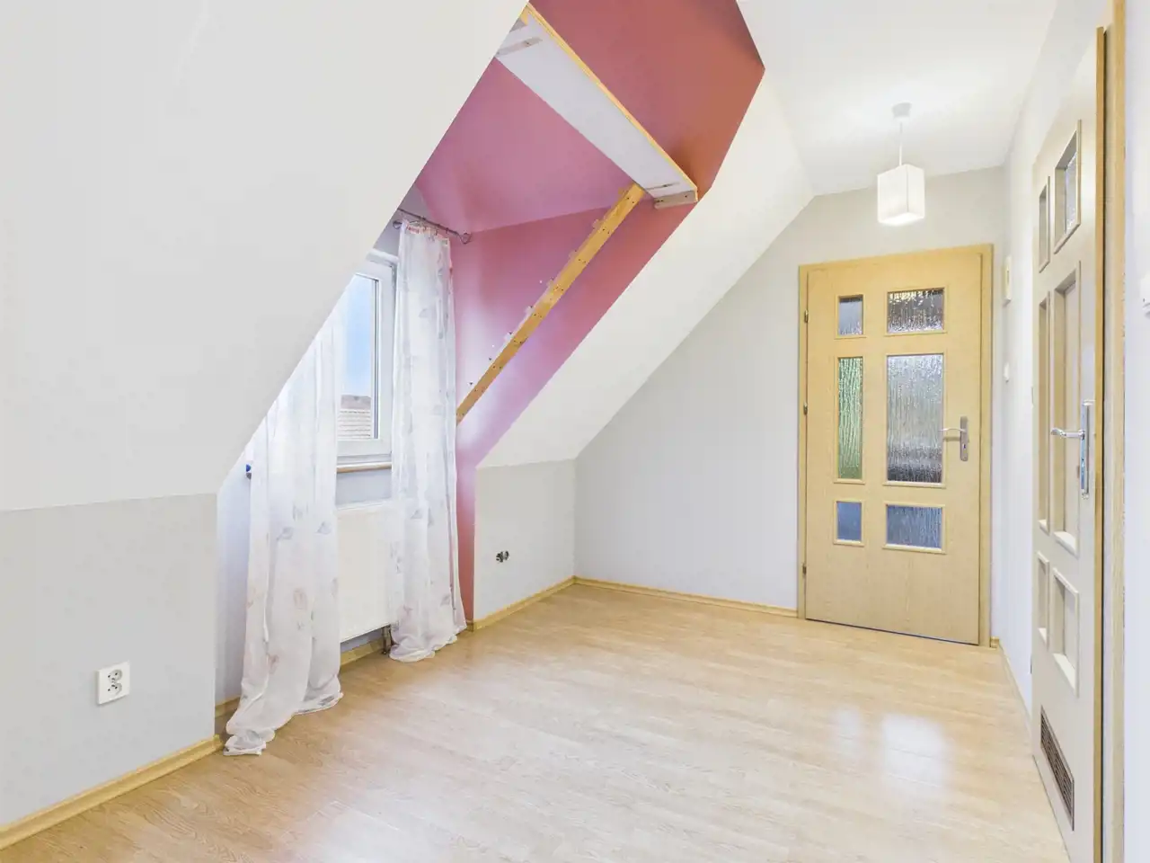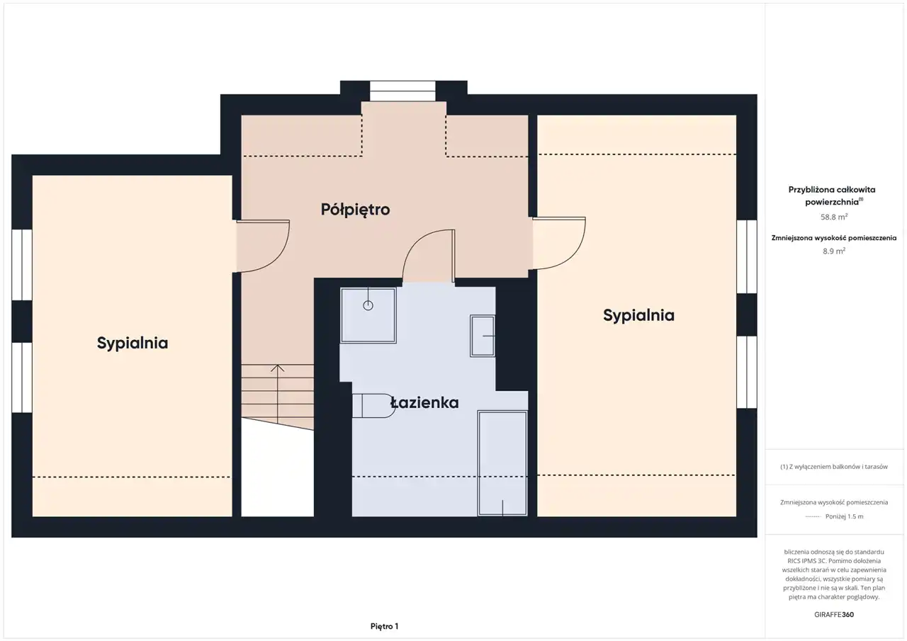 Piętro, na które prowadzą drewniane oświetlone schody mamy: