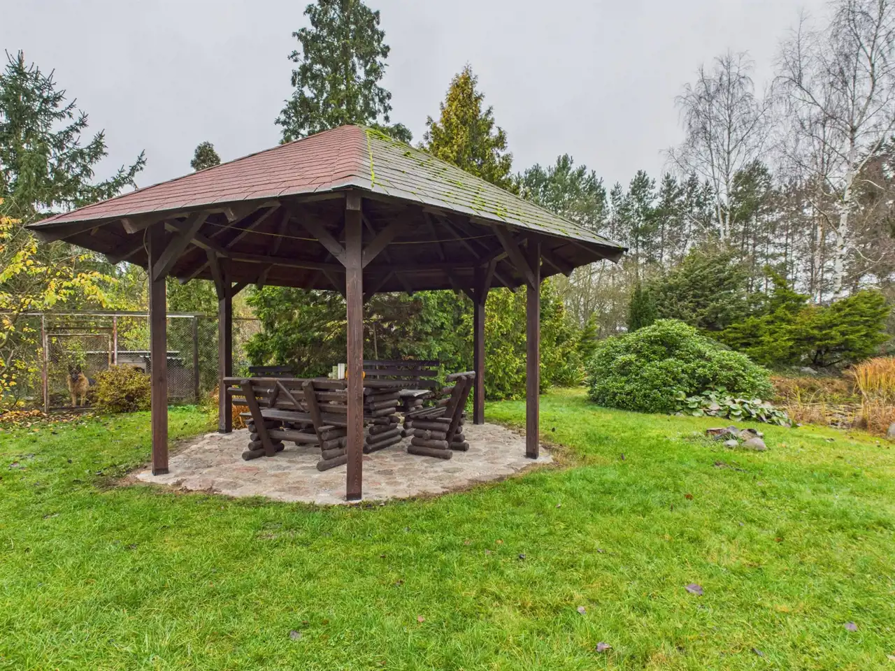 Na działce wiata drewniana z oświetleniem i kamienną podłogą.