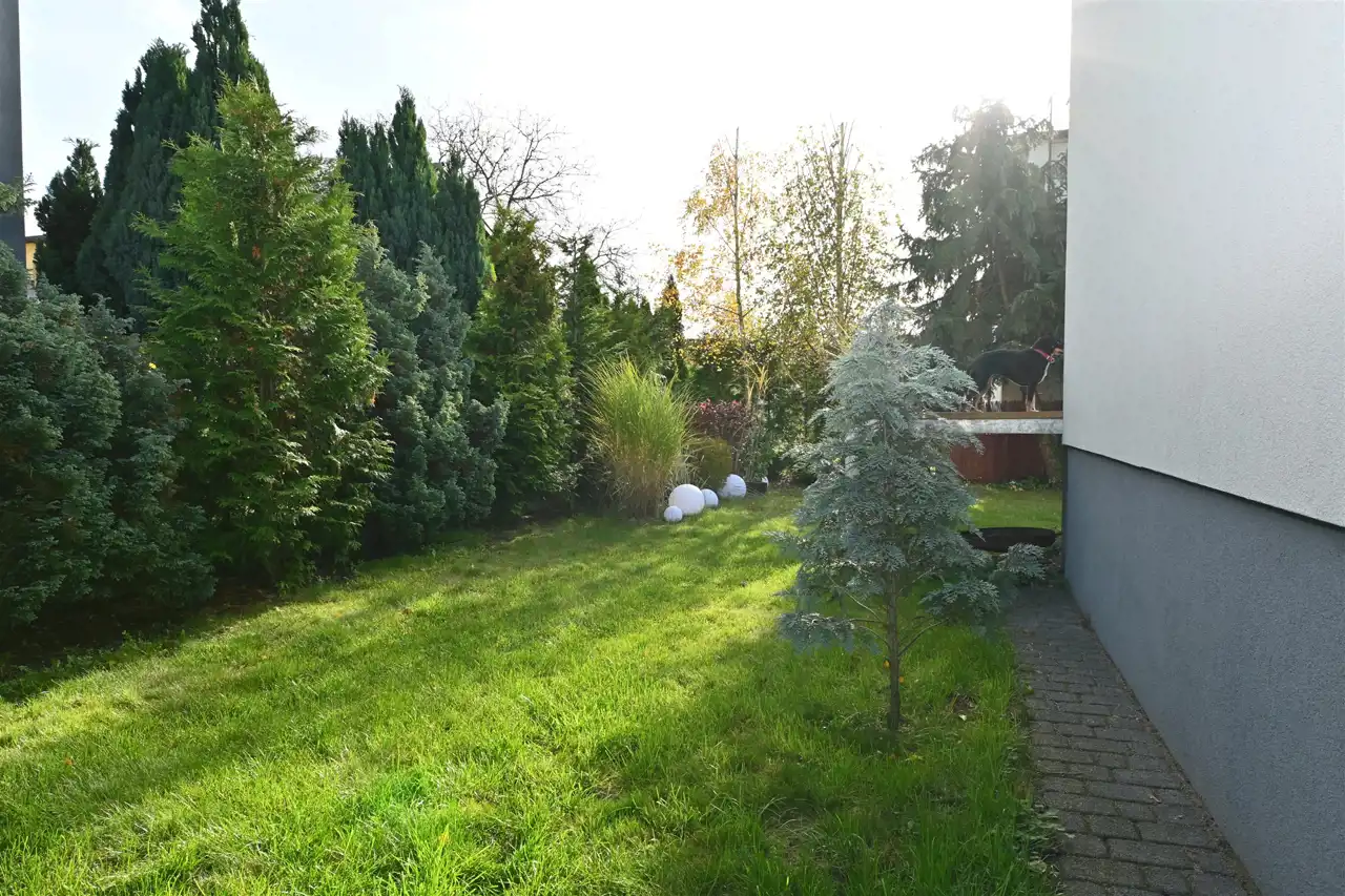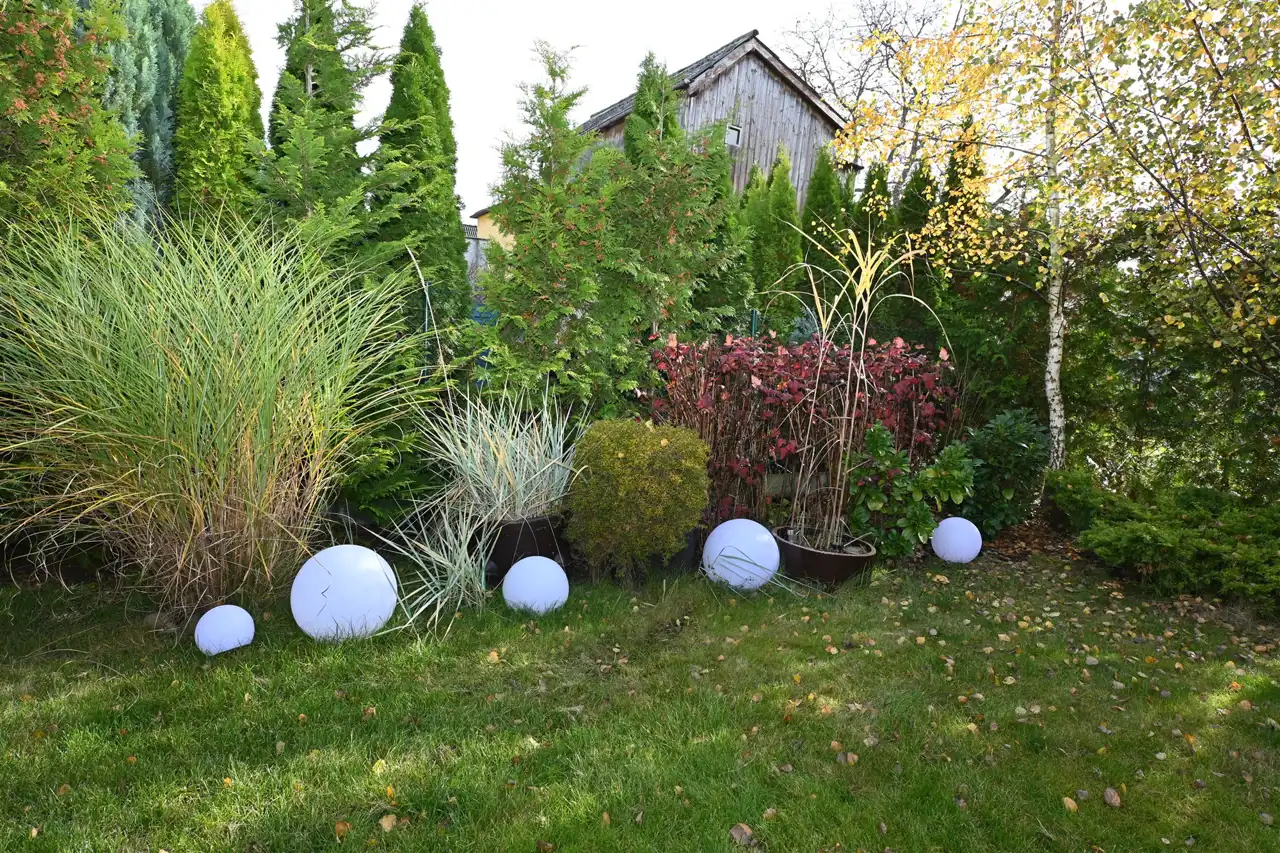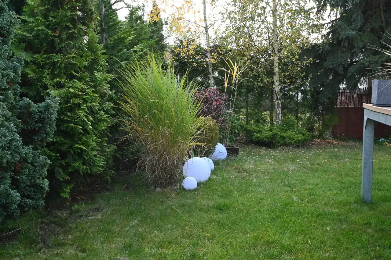 Teren zadbany i zagospodarowany - trawnik, kostka typu Polbruk, nasadzenia
